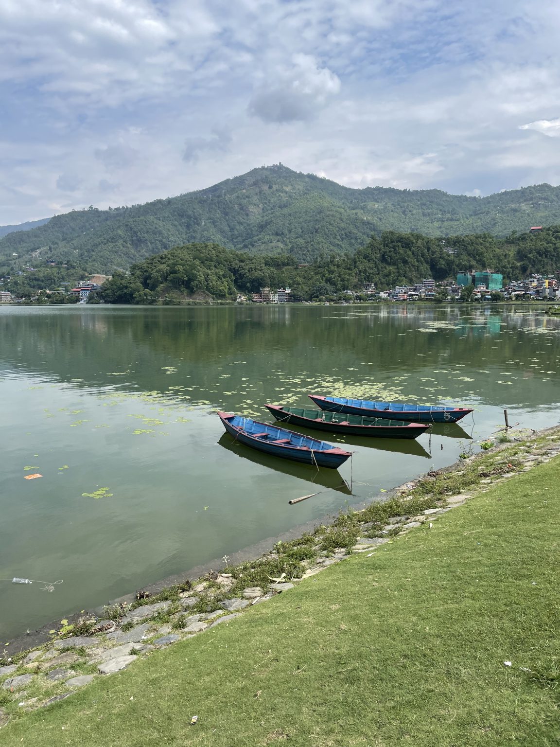 Alternative Text: Three small Boats on Fewa Lake Pokhara, Nepal. Fewa lake is popular for boating and fishing.