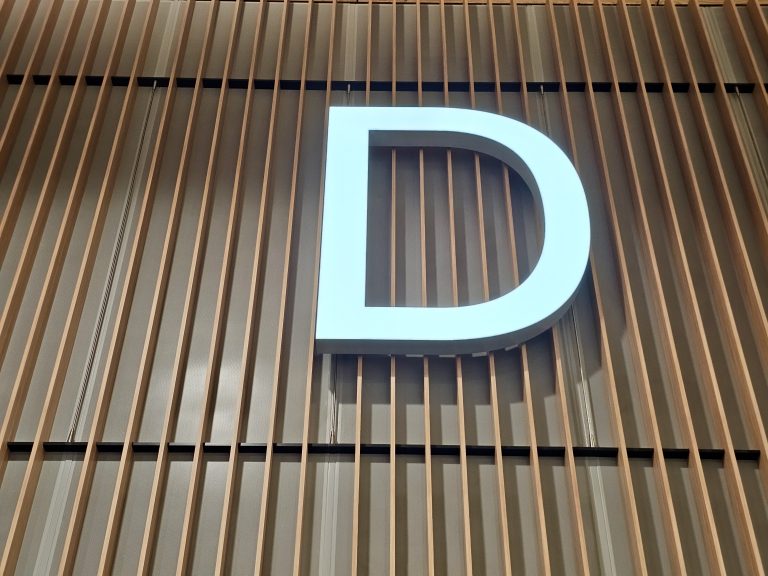 Alternative Text: A large white letter “D” sign mounted on a wall with vertical wooden slats. Captured inside Portland International Airport, this photo shows the minimalist design used for gate or section identifiers in the terminal.