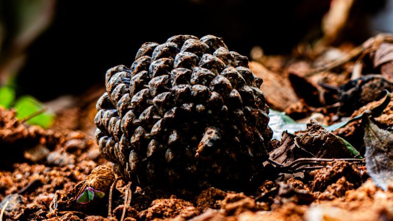 Alternative Text: A close-up of a dark brown pine cone on reddish-brown soil, showing its detailed textured scales.