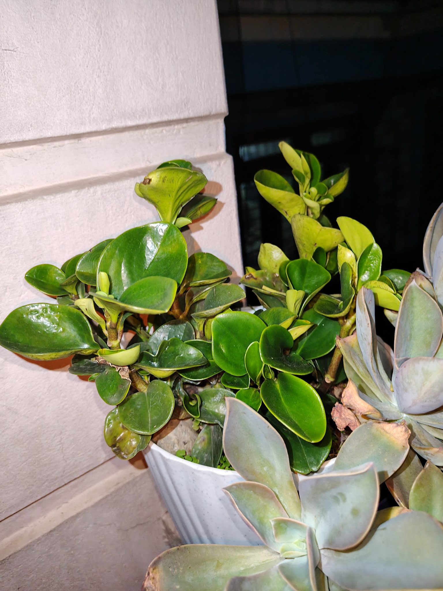 Alternative Text: Close-up of two potted plants—dark green foliage on the left, and a pale blue-green succulent with reddish edges on the right—set against a light wall in evening light.