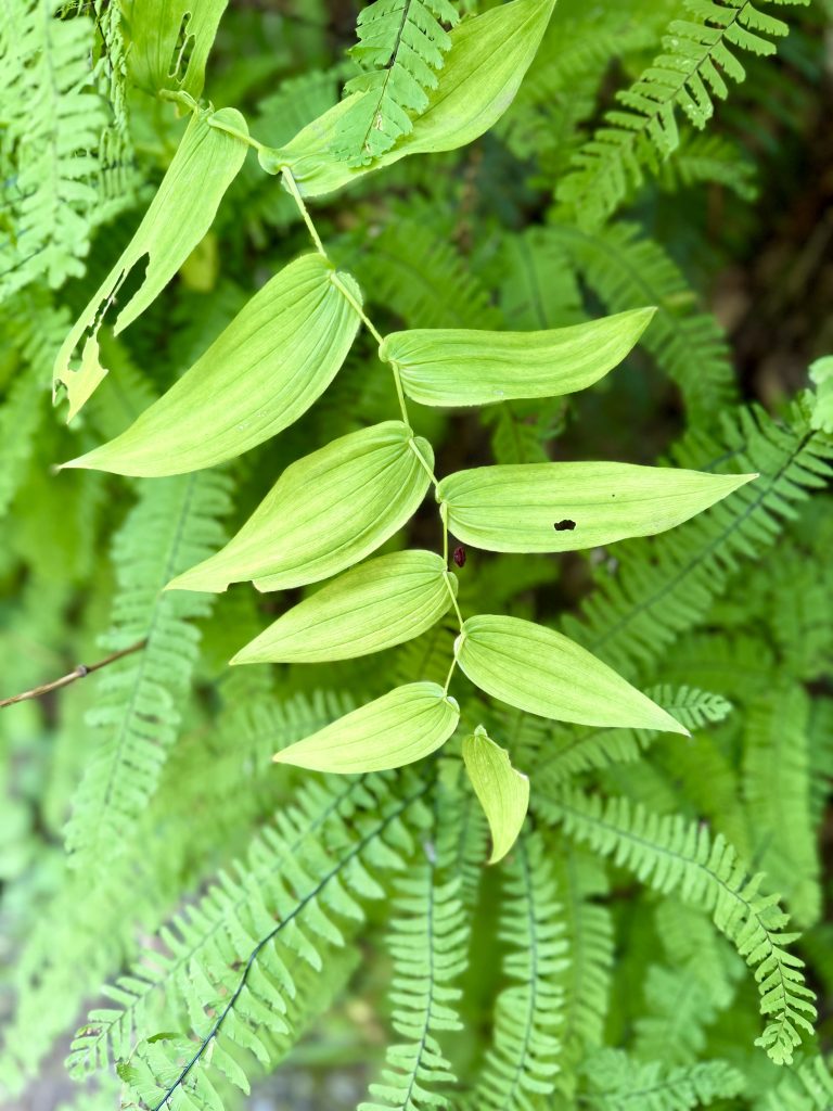 Alternative Text: A branch with light green leaves curves over lush ferns in the forest. The simple shapes and textures highlight nature’s calm beauty. Columbia River Gorge National Scenic Area, Oregon.