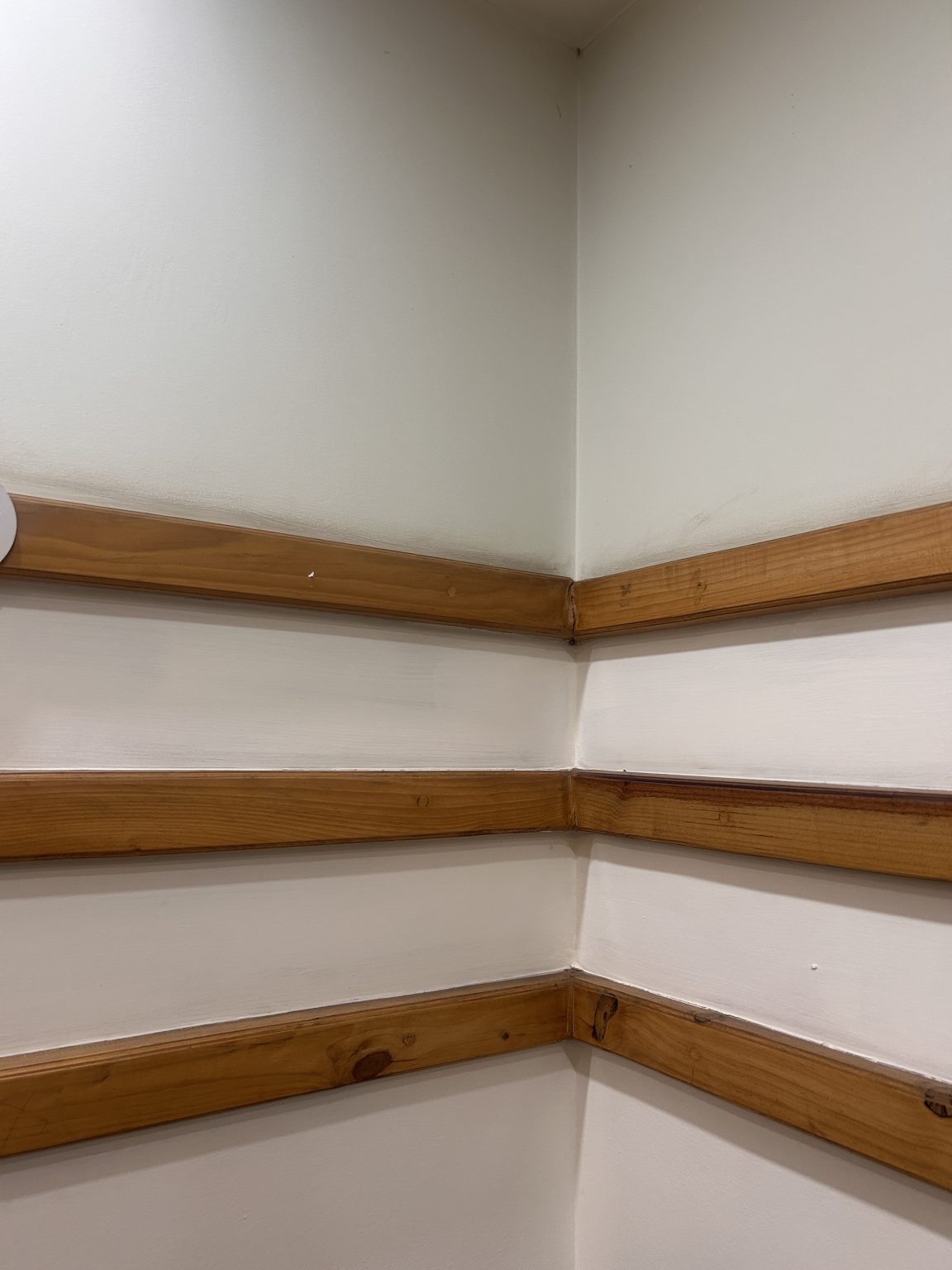 Alternative Text: A corner of a room featuring three parallel wooden railings on each wall, set against light-colored walls.