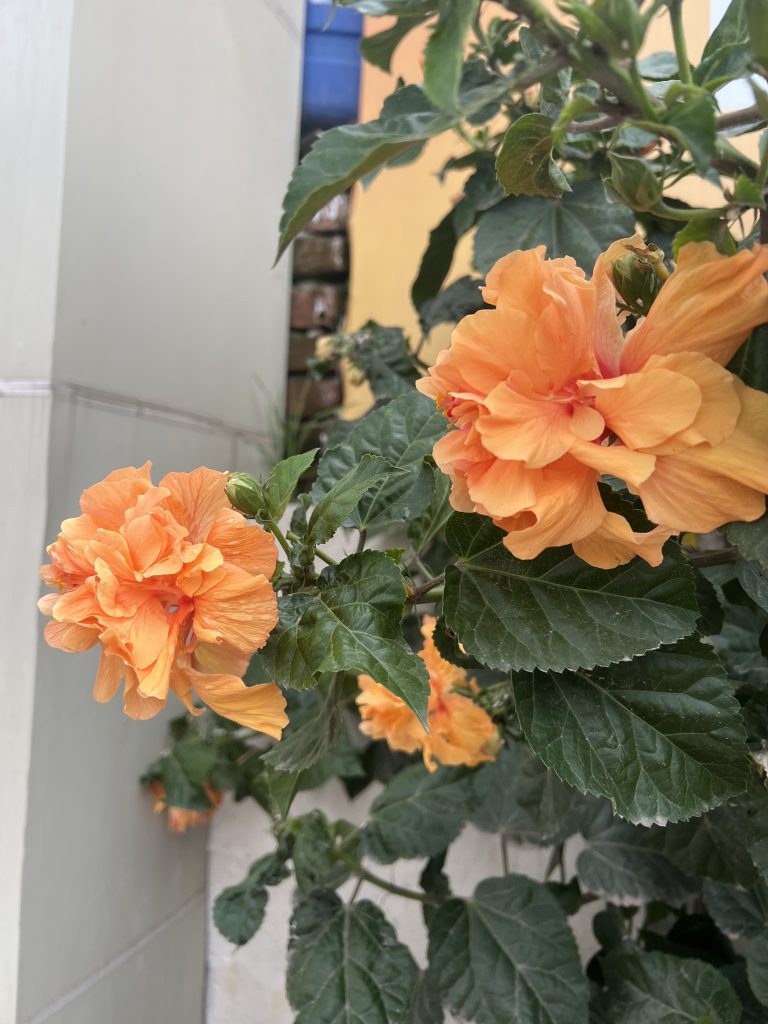Alternative Text: A double-petaled orange hibiscus flower in full bloom, surrounded by blurred green foliage.
