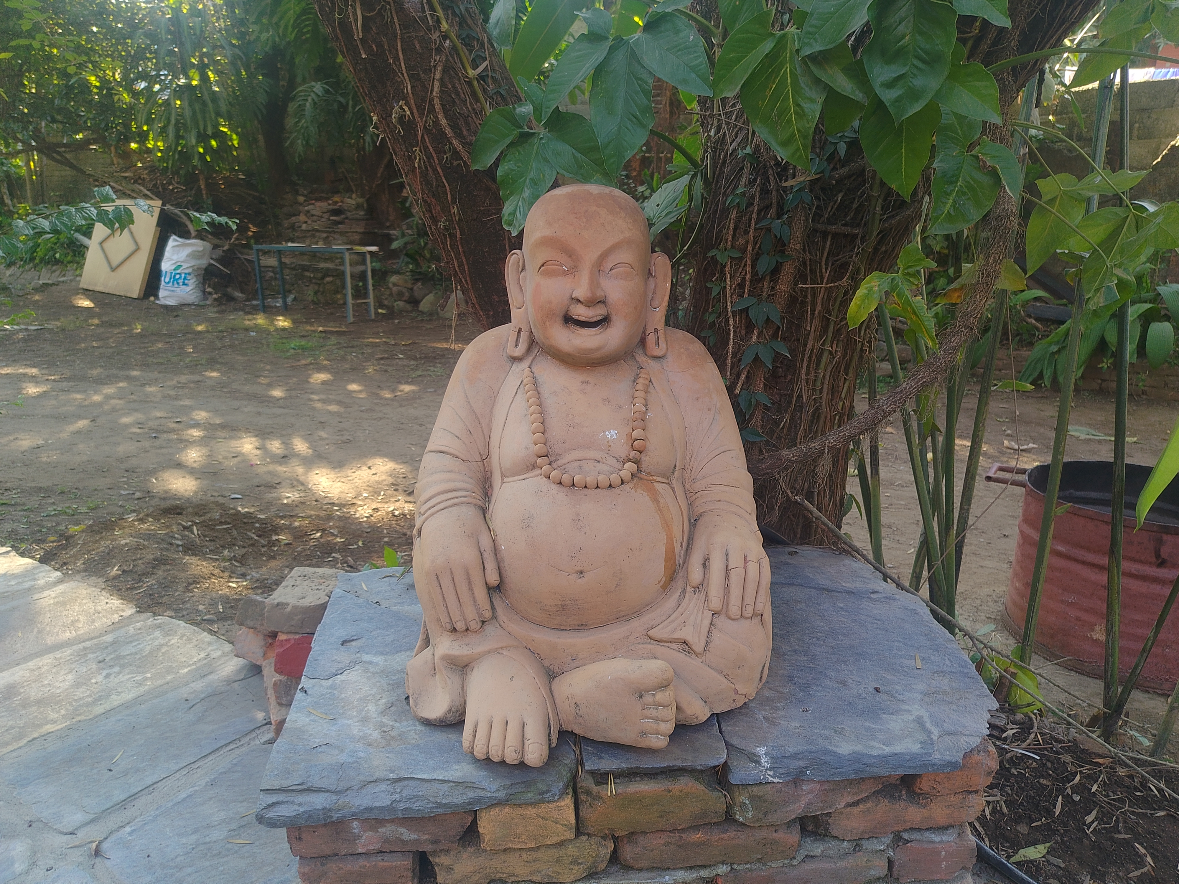 Alternative Text: A seated laughing buddha with a round belly, simple robe, and beaded necklace.