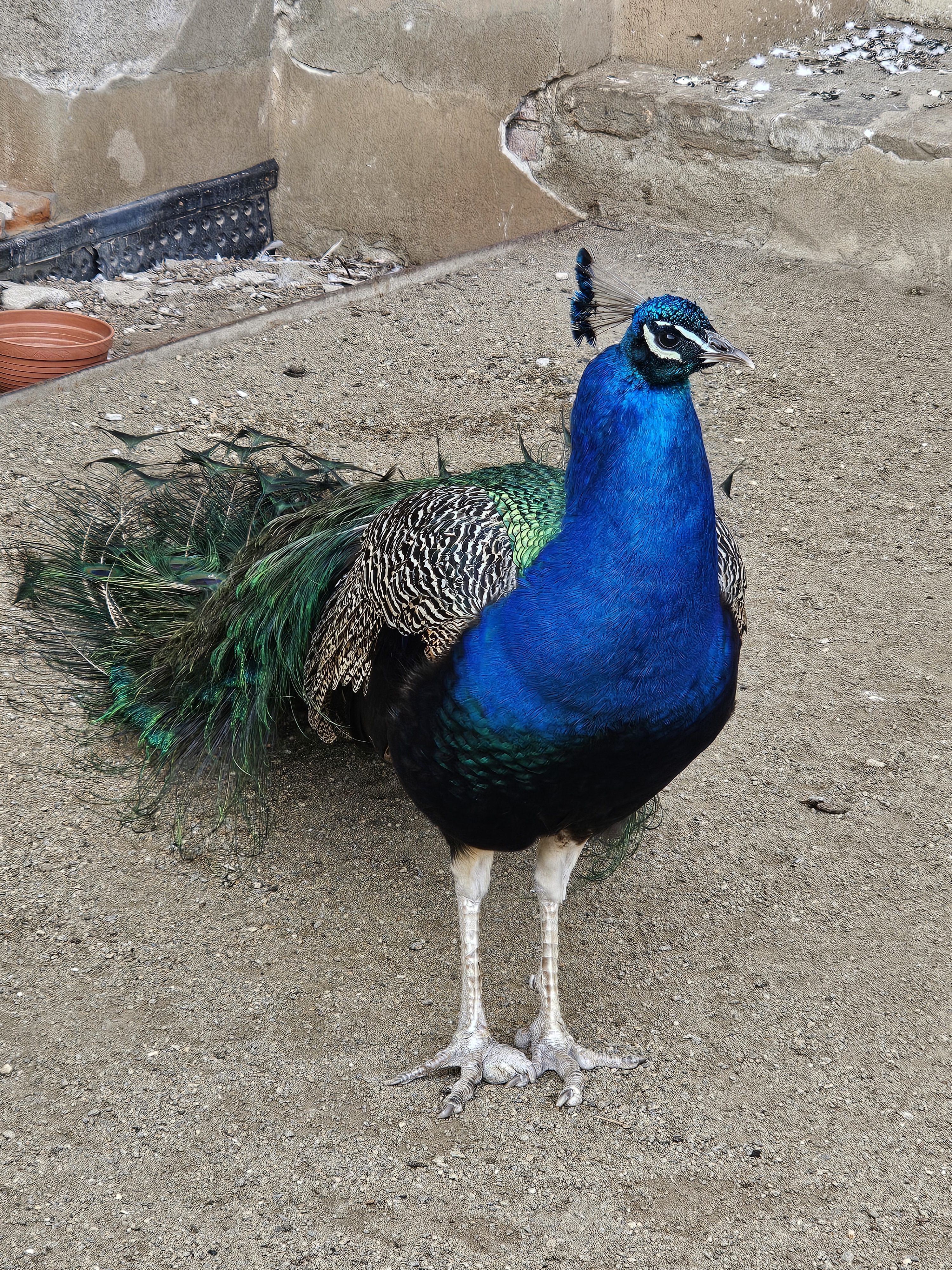 Alternative Text: A vibrant Indian peafowl standing on a sandy surface. The peacock’s bright blue neck and chest contrast with its patterned back and green-tinged tail feathers.