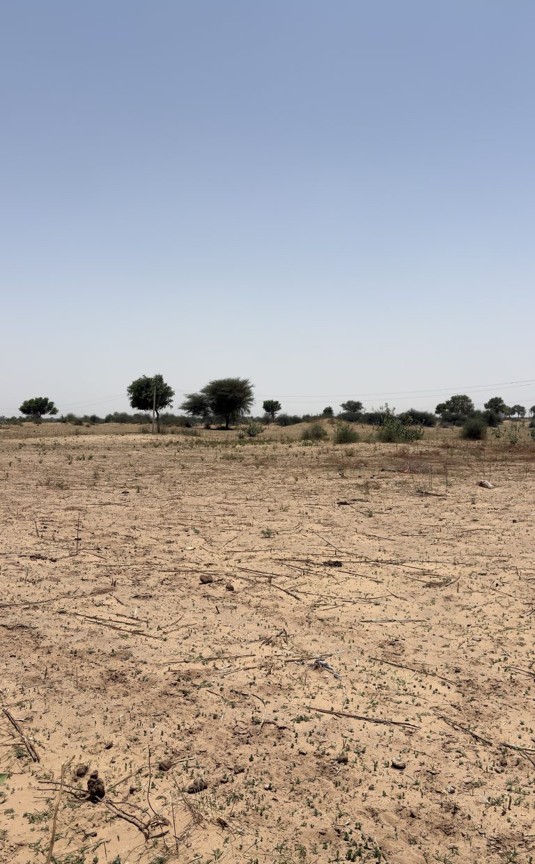 Alternative Text: A dry landscape featuring a flat expanse of sandy soil scattered with small patches of green vegetation. Several sparse trees are visible in the background under a clear blue sky.