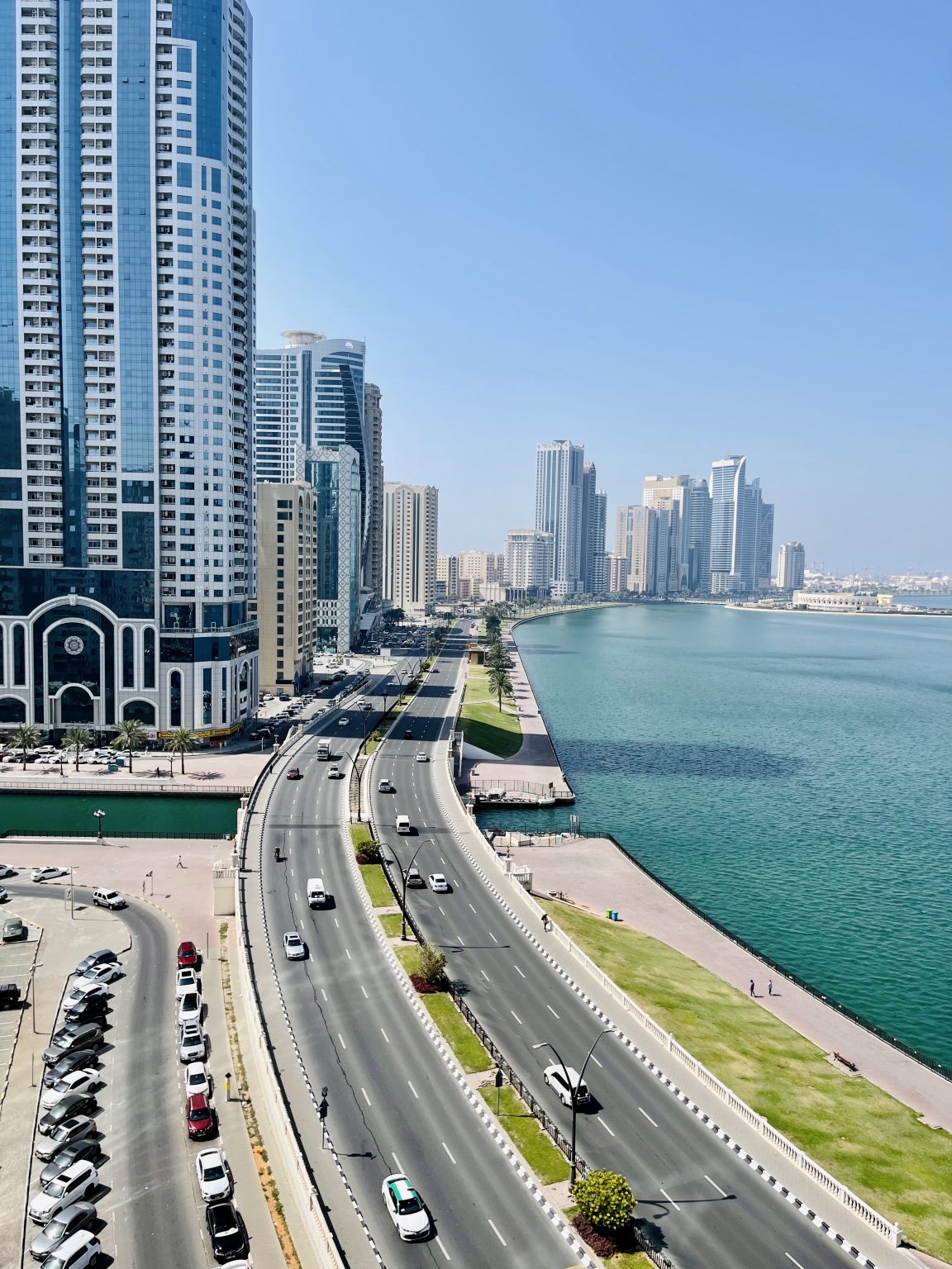 Alternative Text: A panoramic view of a picturesque urban waterfront scene featuring a wide road bordered by tall modern skyscrapers on the left and a calm body of water on the right. The skyline showcases various architectural styles, and several cars are seen traveling along the road. Green lawns and palm trees line the waterfront pathway, where a few people are walking.