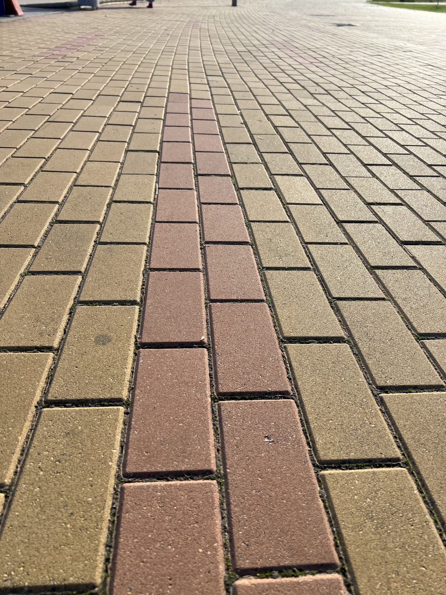 Alternative Text: Rectangular yellow tile pavement, with a double line of red tiles tracing a path forward.