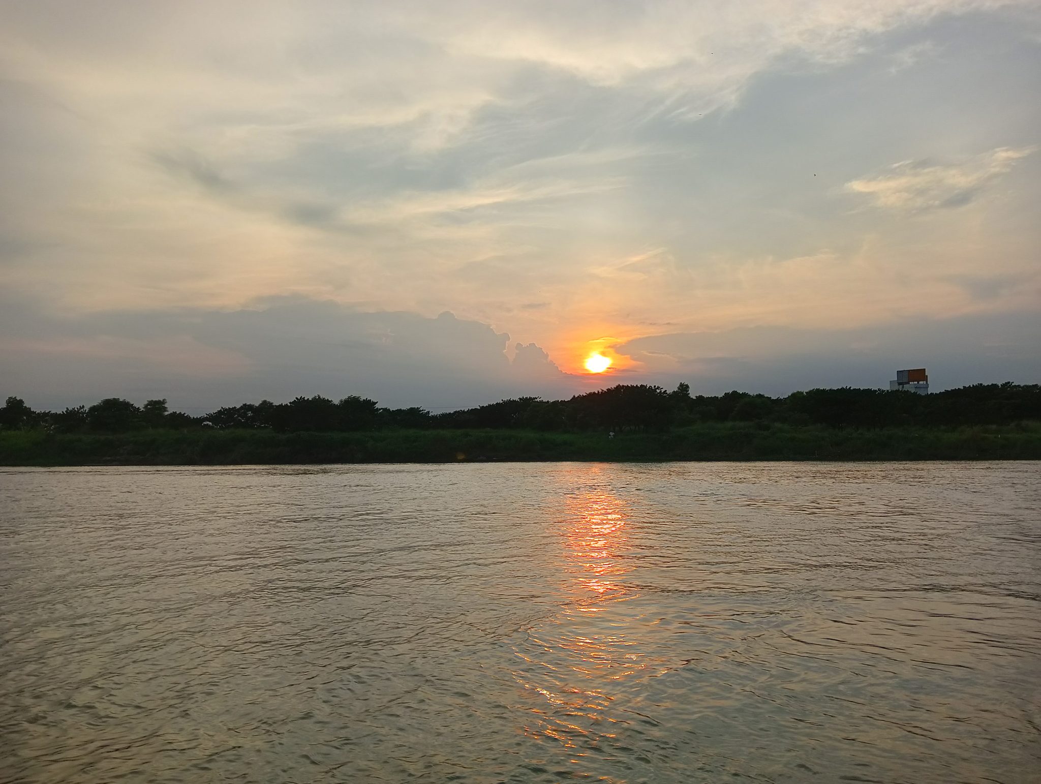 Alternative Text: A tranquil river scene at sunset, with the sun partially hidden behind clouds, casting a warm orange glow on the water’s surface.