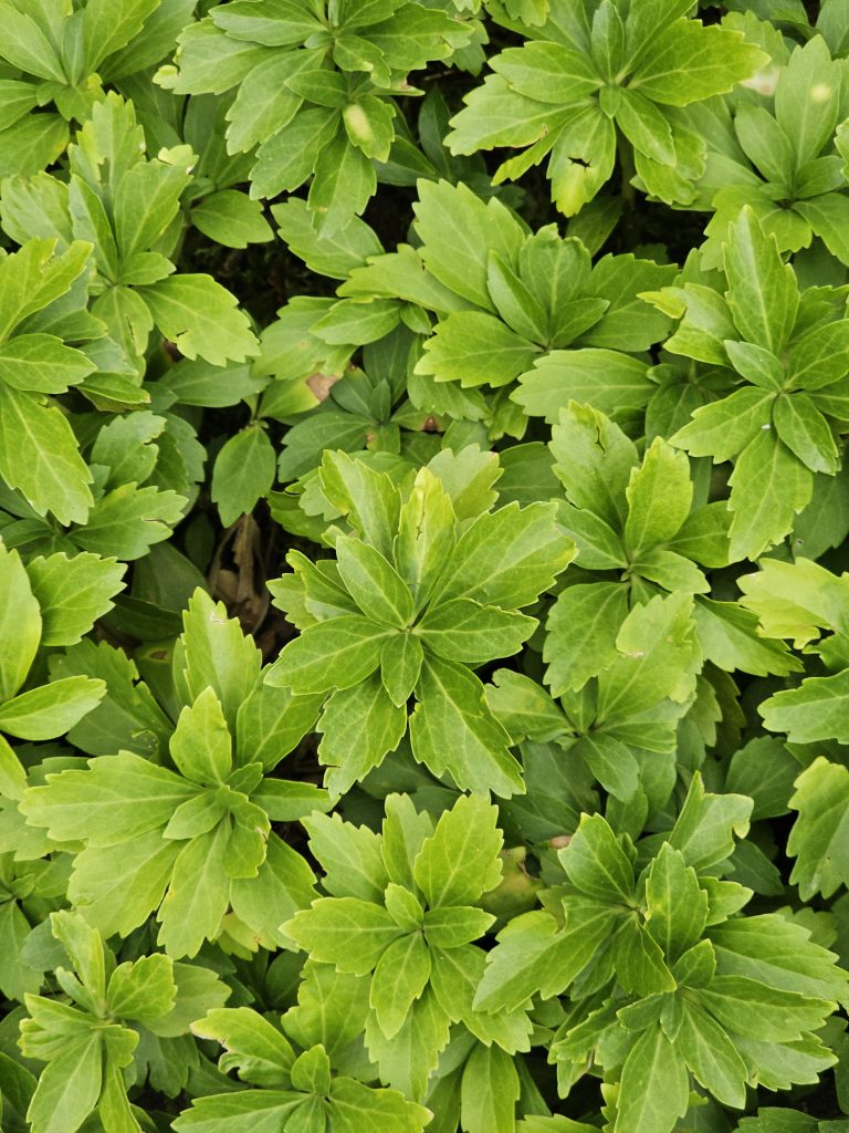 Alternative Text: Top-down view of dense green foliage with pointed leaves at the Portland Japanese Garden. The image captures the detailed leaf patterns and fresh growth.