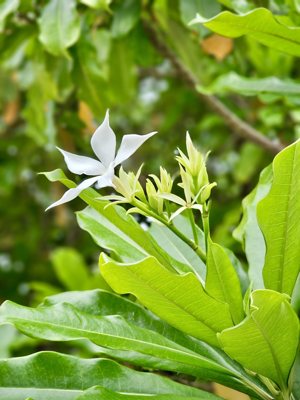 Alternative Text: A striking white flower of sea mango or pong pong tree (Cerbera odollam) in full bloom among unopened buds and bright green leaves. Captured near Fort Kochi Beach, Kerala.