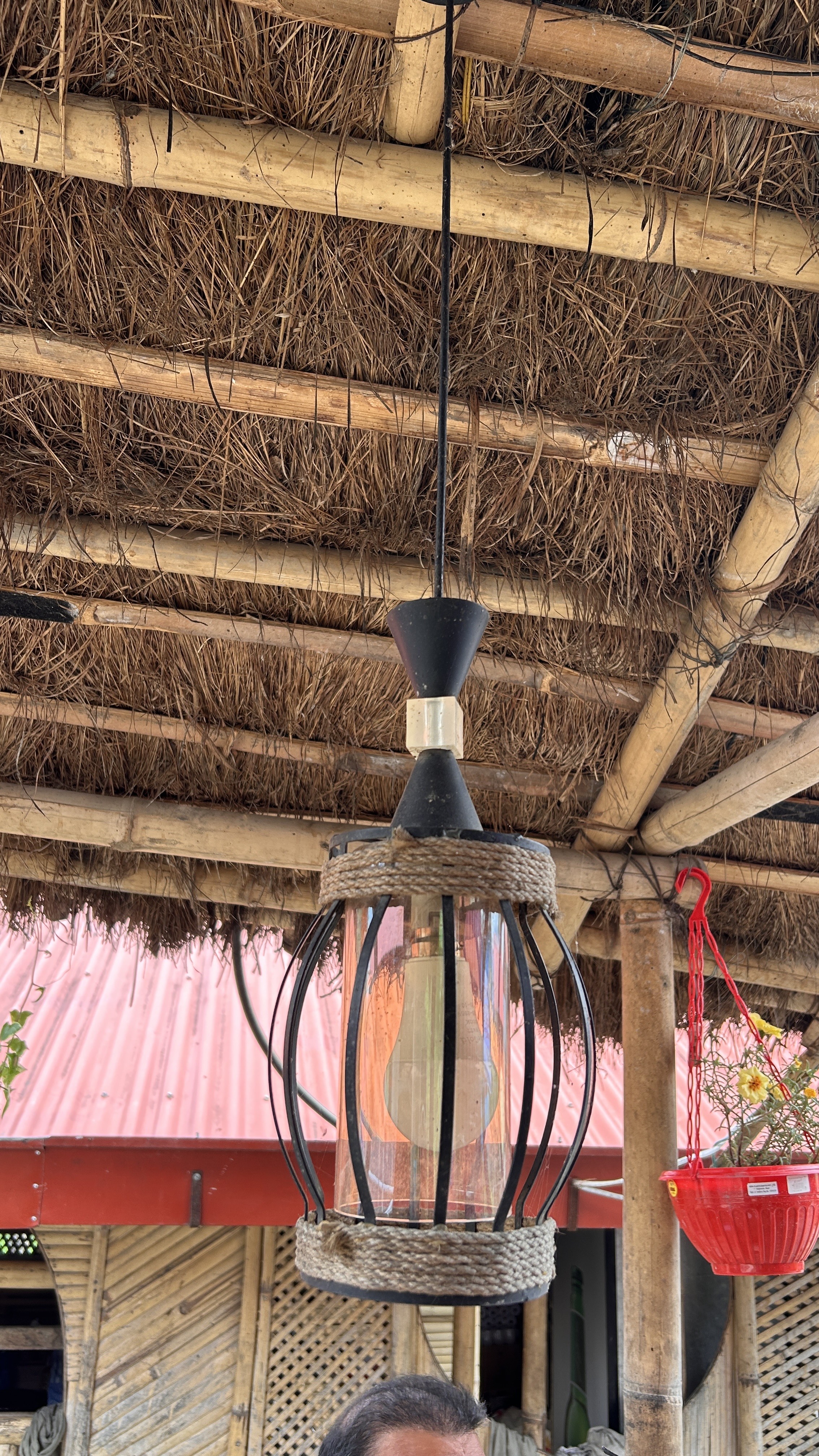 Alternative Text: A hanging lantern with a black metal frame and a clear glass bulb, suspended from a straw-thatch roof supported by wooden beams.