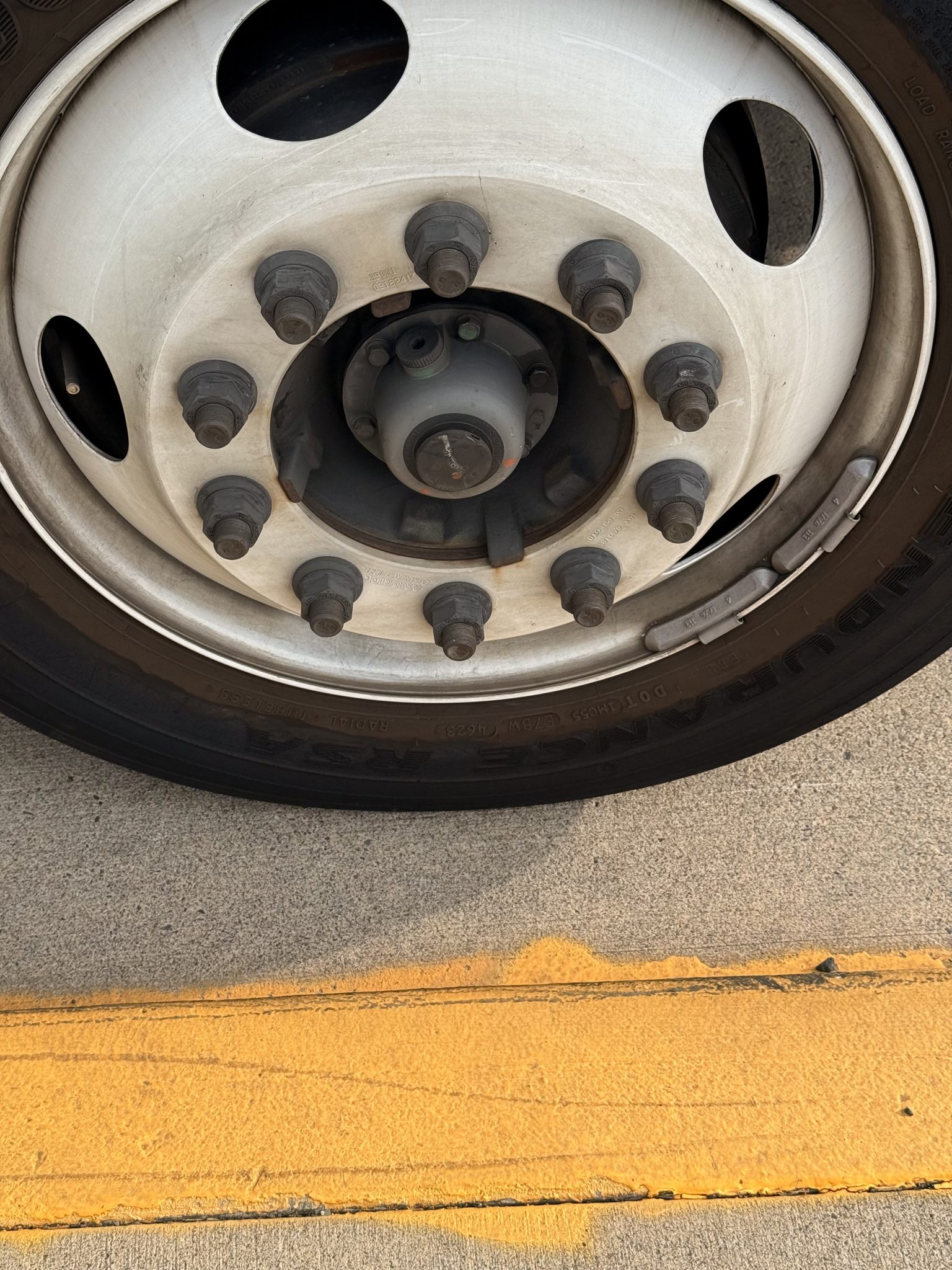 Alternative Text: Close-up view of a large vehicle tire with visible lug nuts and a concrete sidewalk marked by a yellow line, taken from the streets of Portland.