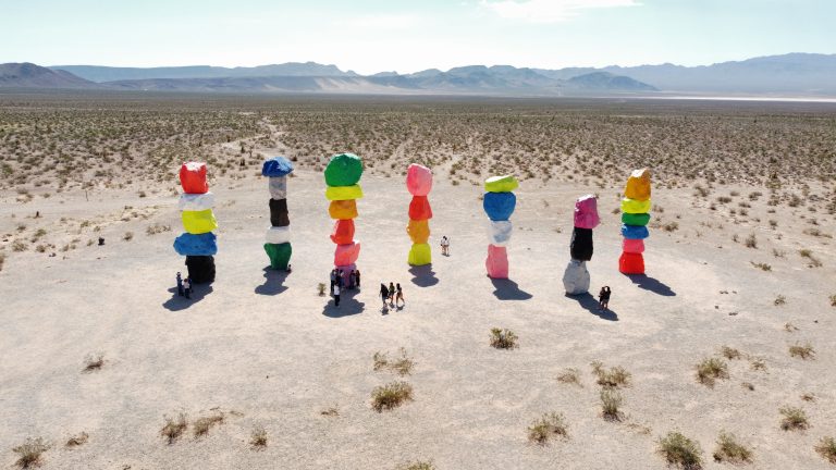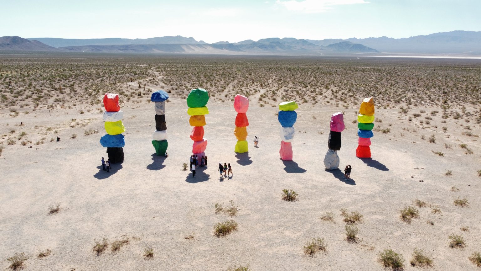 Alternative Text: “Painted Rocks” art display, Las Vegas, Nevada. Large boulders painted and placed in 7 stack which reach 3 stories high, placed in a desert clearing.