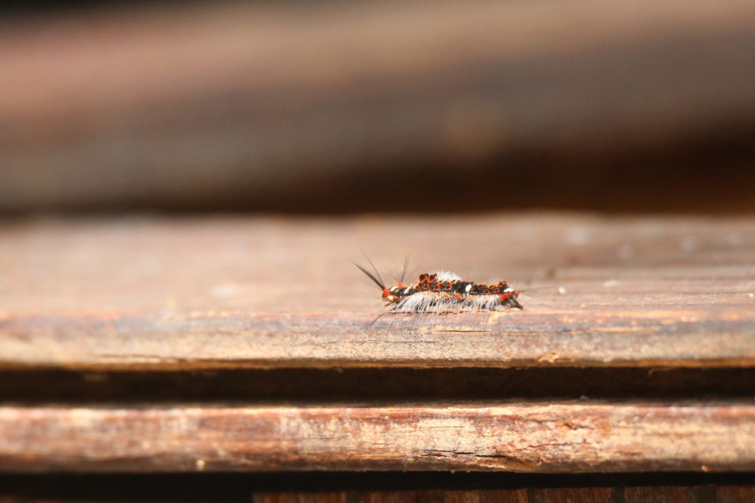 Alternative Text: A smeared dagger moth is crawling on a wooden board.