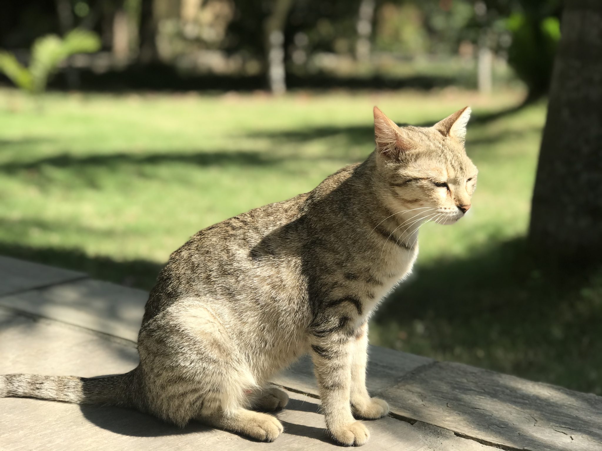 Alternative Text: A striped brown cat sits on a wooden deck in the sun, with a green lawn and trees in the background.