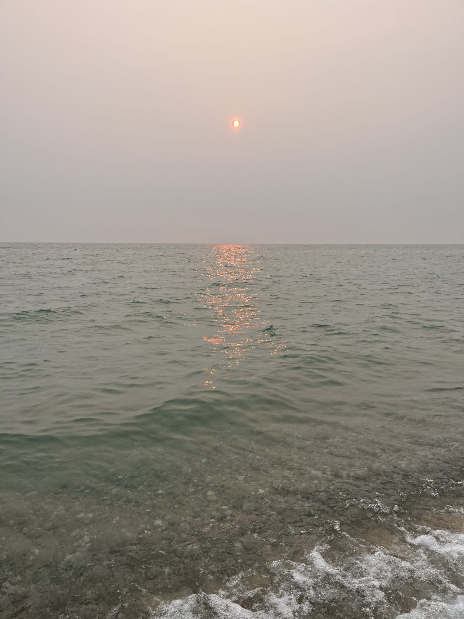 Alternative Text: Pinpoint of sun in a hazy sky over Lake Michigan.