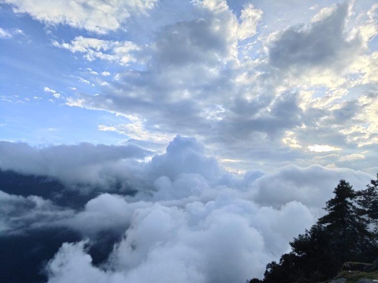 Alternative Text: A panoramic view of a blue sky filled with fluffy white clouds, some illuminated by sunlight.