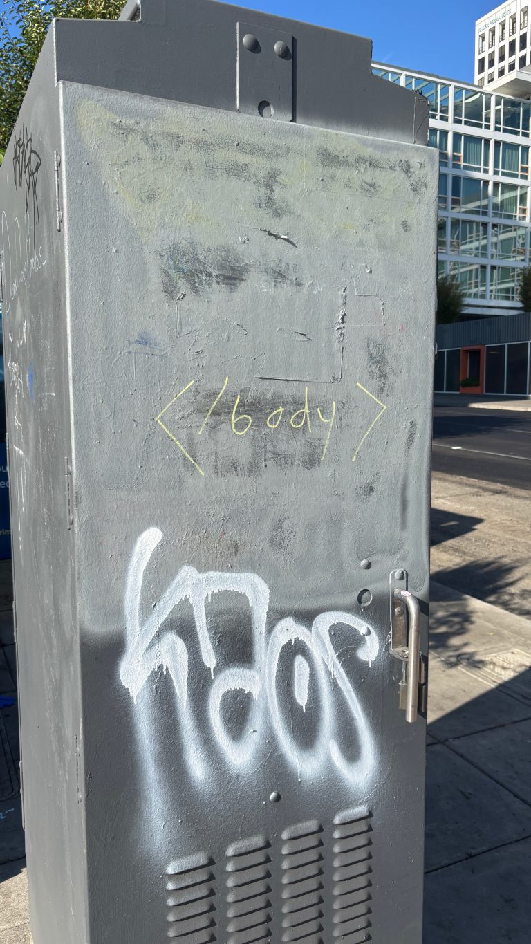 Alternative Text: A public utility box about as tall as a person. There’s graffiti on it, including the closing body tag from HTML.