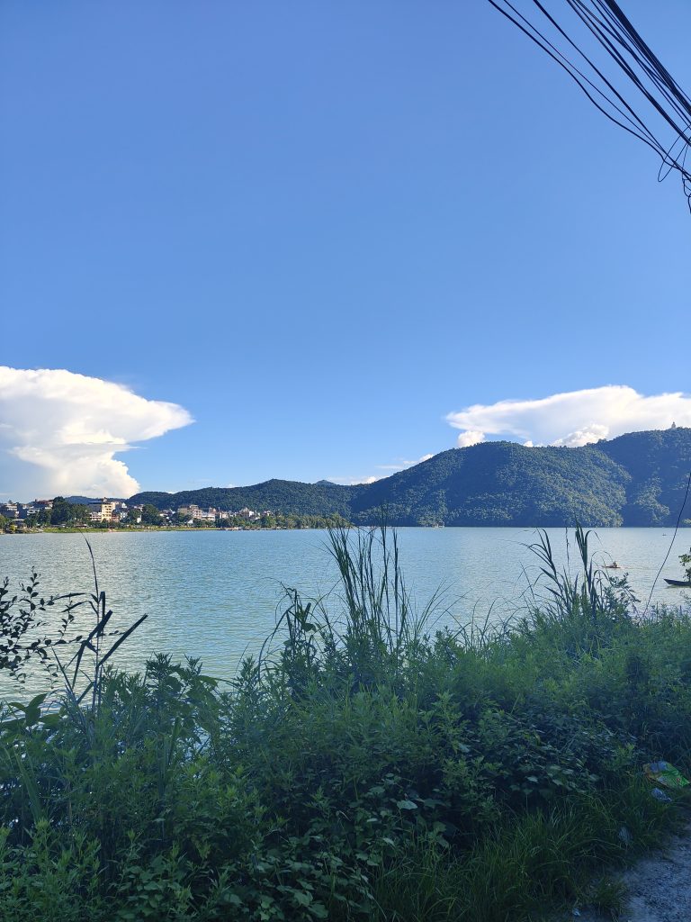 Alternative Text: A serene Phewa lakeside scene showcasing calm waters reflecting a clear blue sky scattered with fluffy white clouds
