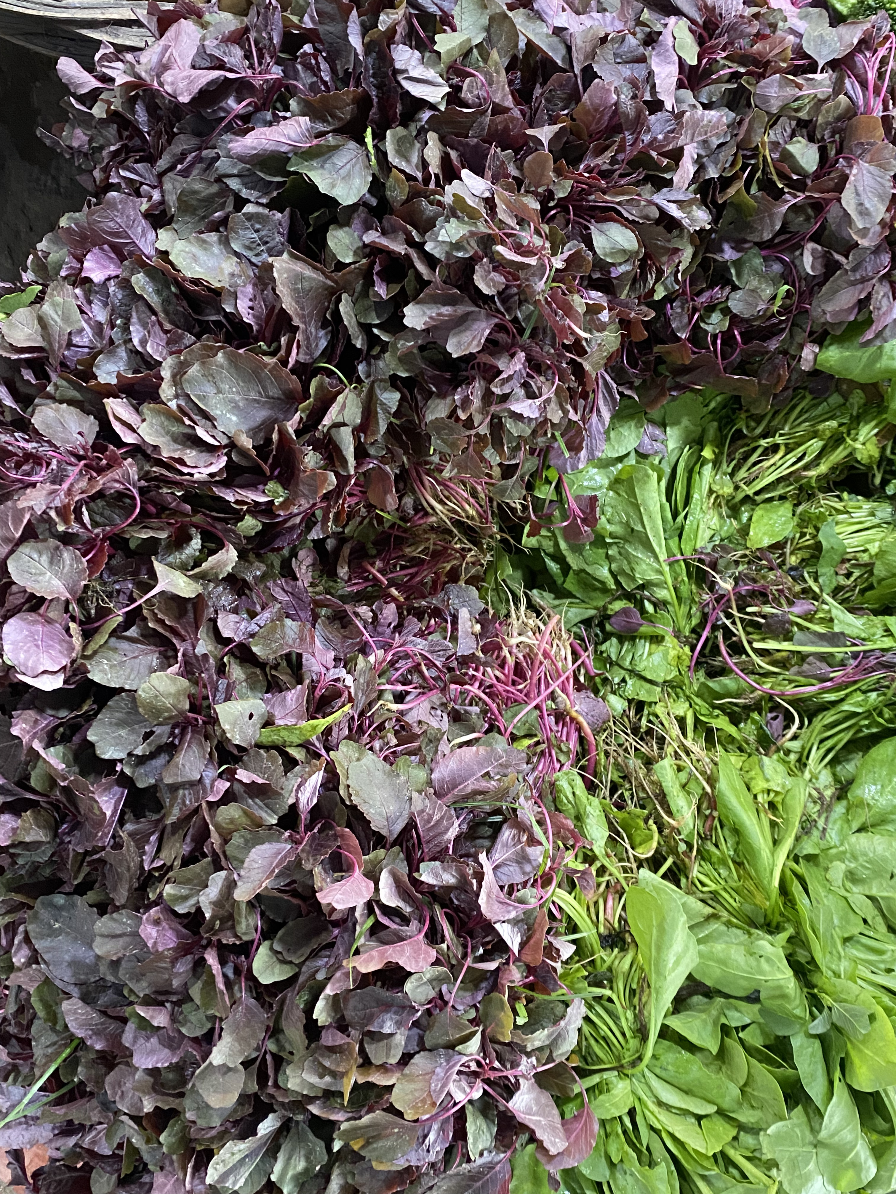 Alternative Text: A close-up view of leafy greens arranged in a mixed pile, featuring dark purple and green leaves