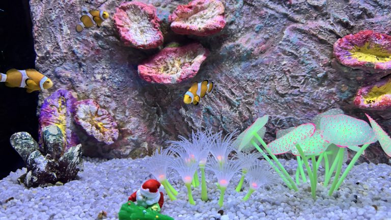 Alternative Text: Three orange and white clownfish swim near glowing white sea anemones and a small Santa Claus figurine.
