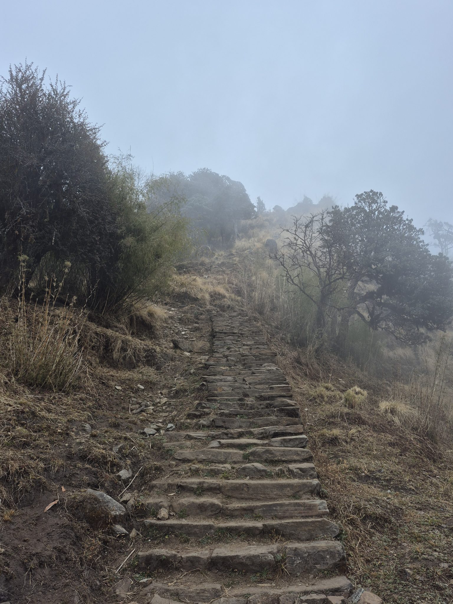 Alternative Text: A set of stone steps leads up a steep, foggy hillside.