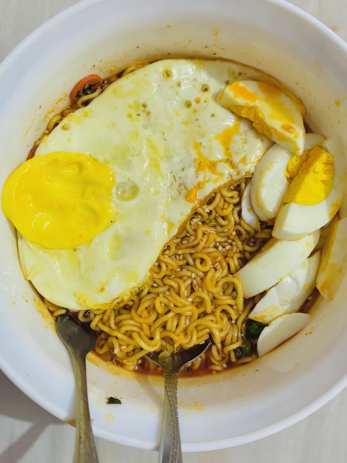 Alternative Text: A white bowl of spicy noodles topped with a fried egg and sliced boiled egg, with rich yellow yolks contrasting the golden noodles.