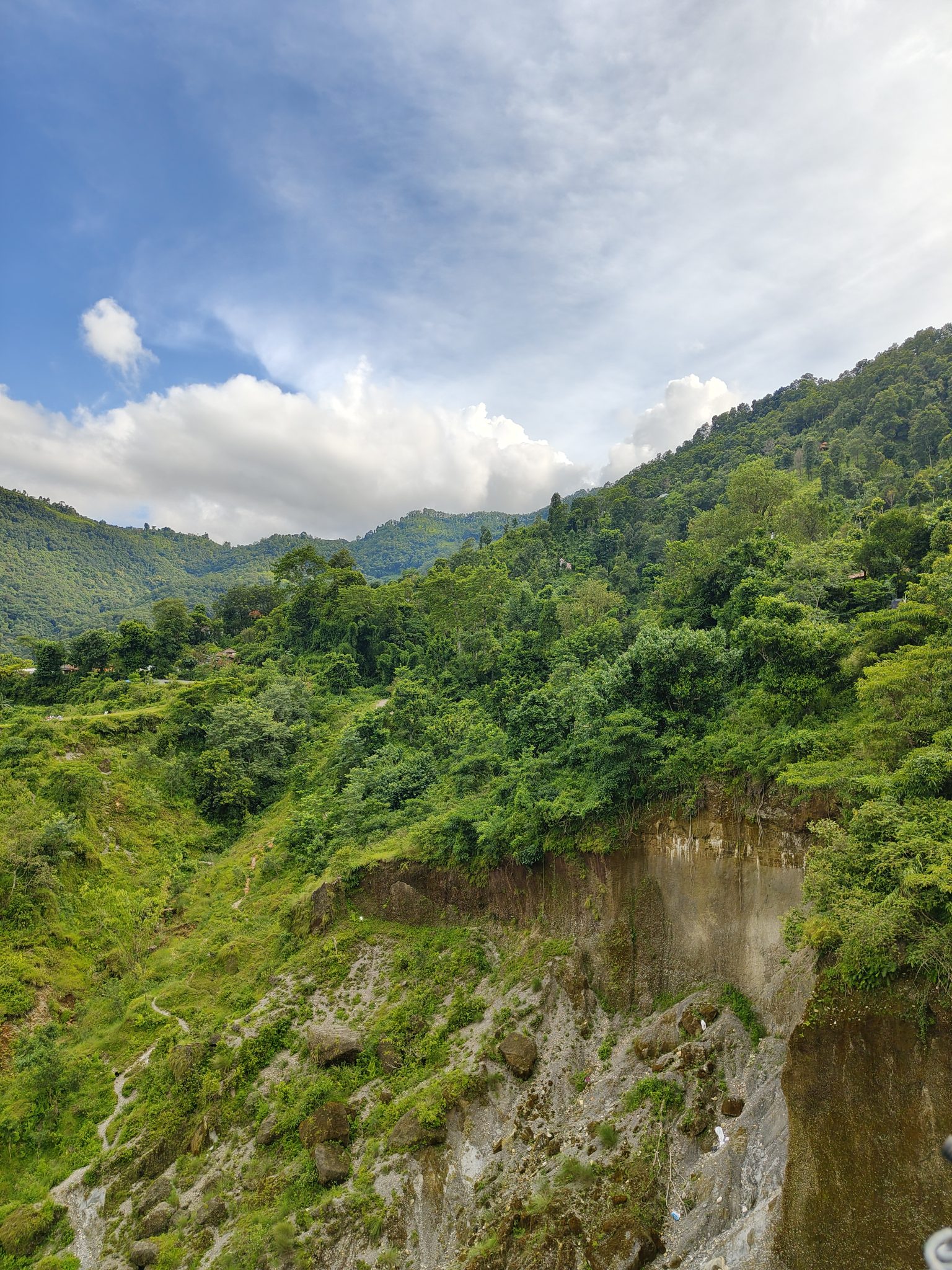 Alternative Text: A scenic view of lush green hills under a partly cloudy sky, with patches of blue peeking through the clouds. The terrain is rugged, featuring a steep slope with a mix of rocky outcrops and dense vegetation, creating a vibrant landscape