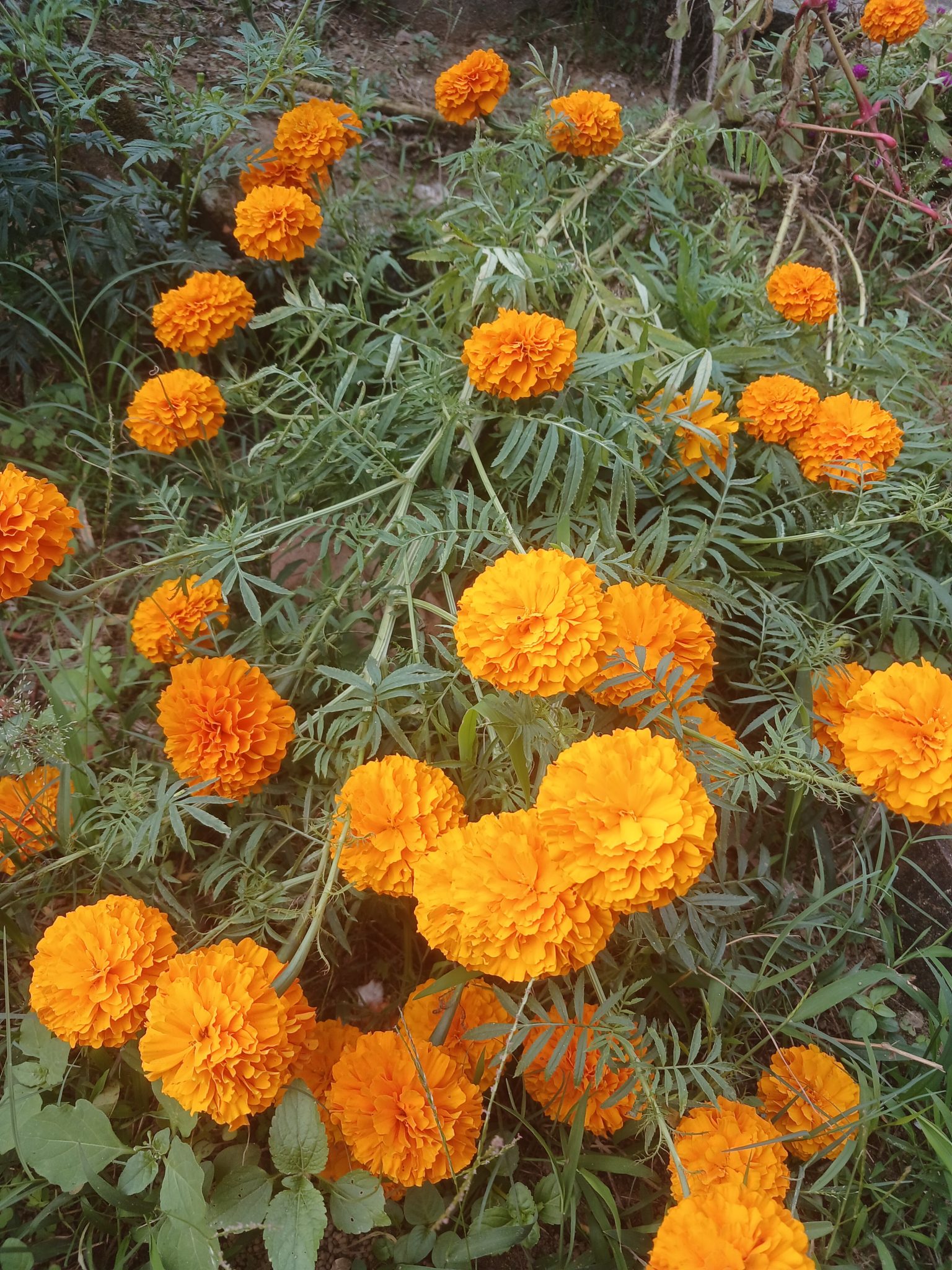 Alternative Text: A vibrant cluster of orange marigold flowers is blooming among green foliage.