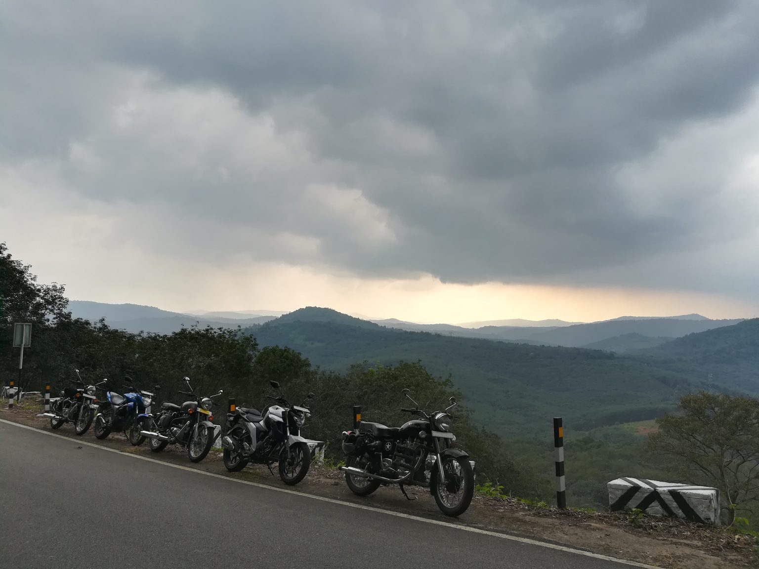 Alternative Text: Motorcycles parked on the side of a road with mountains in the background