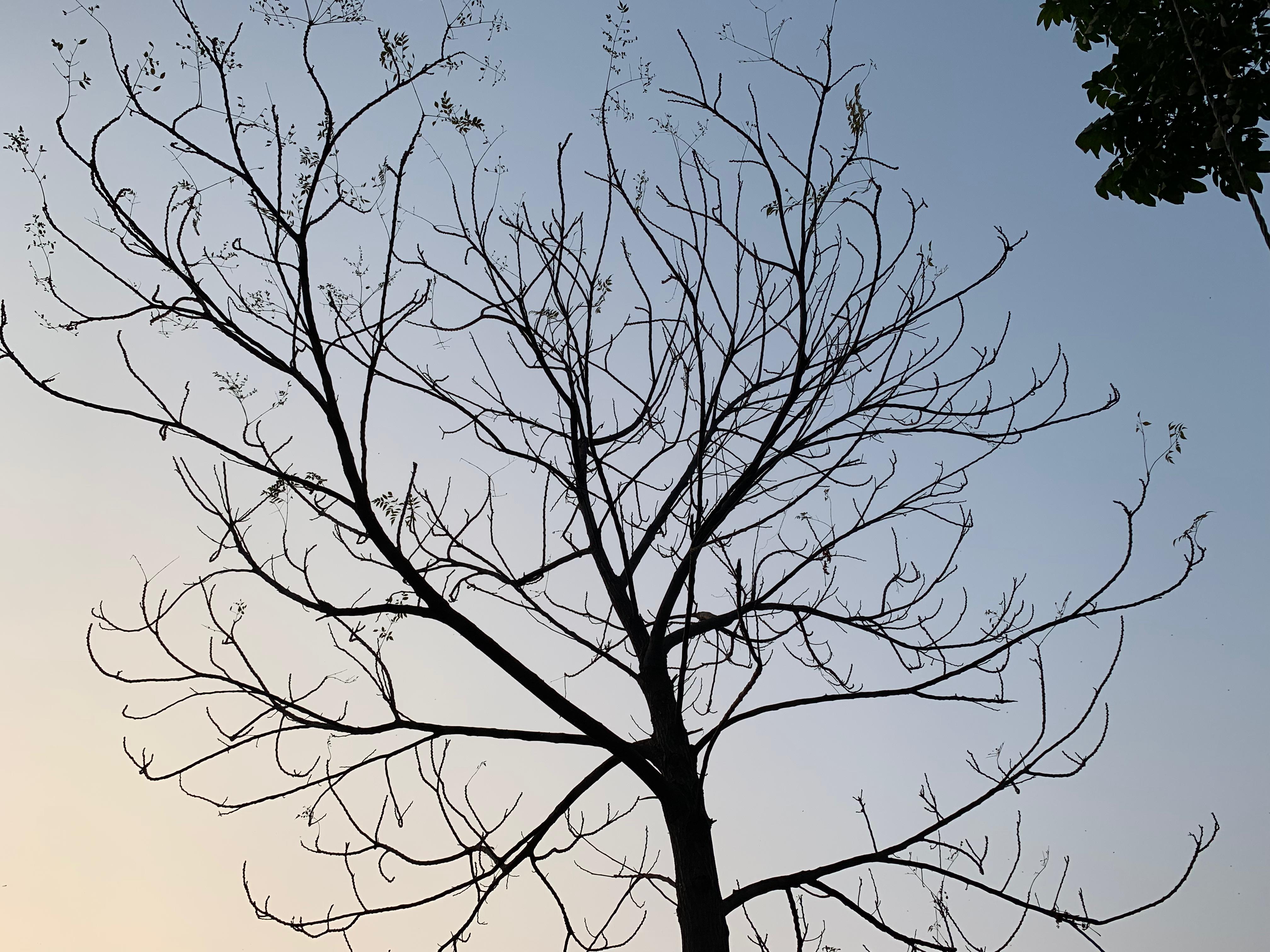 Alternative Text: A silhouetted tree with barren branches against a gradient sky transitioning from soft blue to light gray.