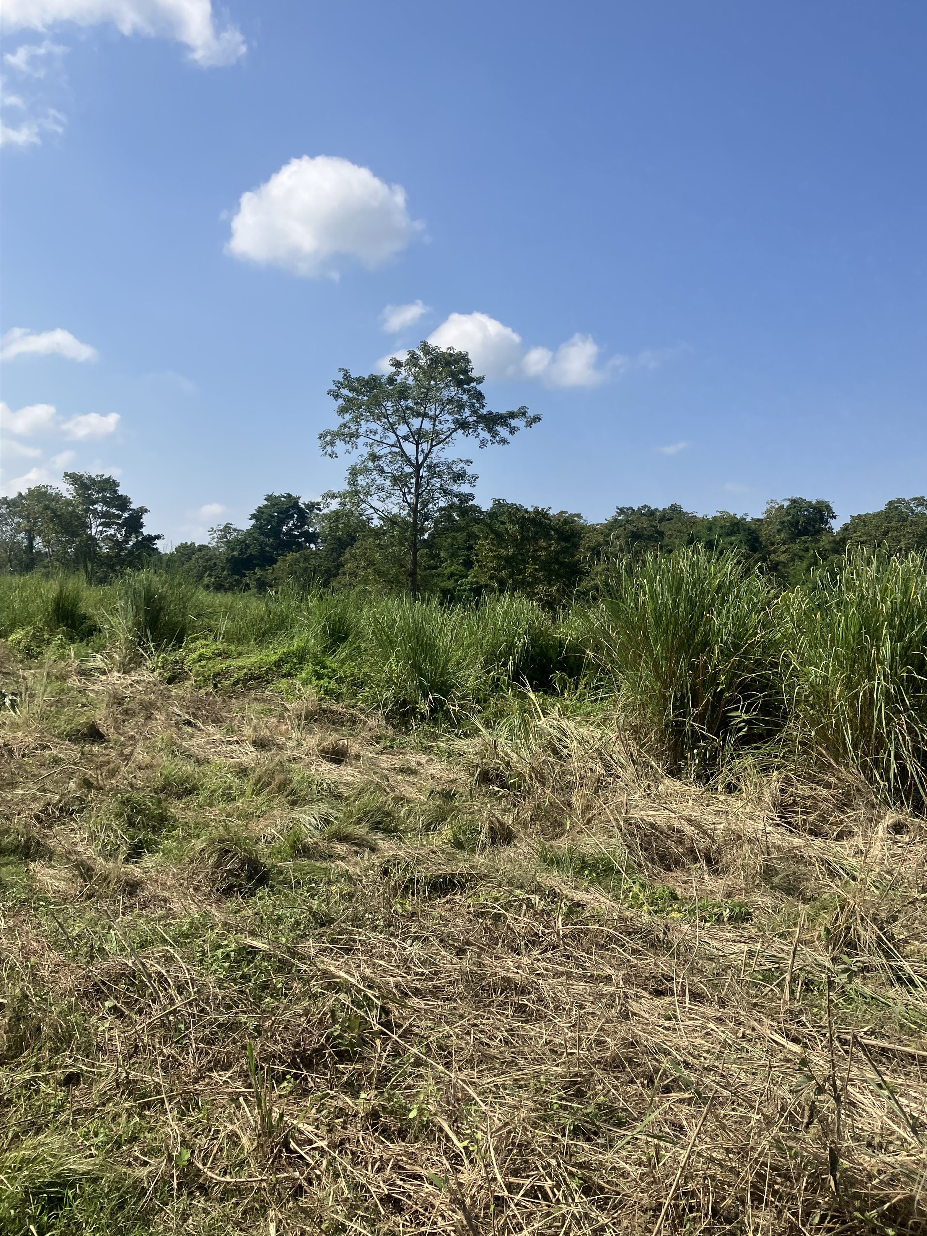Alternative Text: A landscape featuring tall grasses and a few trees under a bright blue sky with scattered white clouds.
