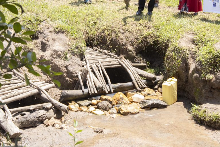 Alternative Text: A small stream flows through a rocky area, where a well made of wooden logs and branches crossing over it. Beside the stream, there are some scattered stones and a yellow water container resting on the ground.