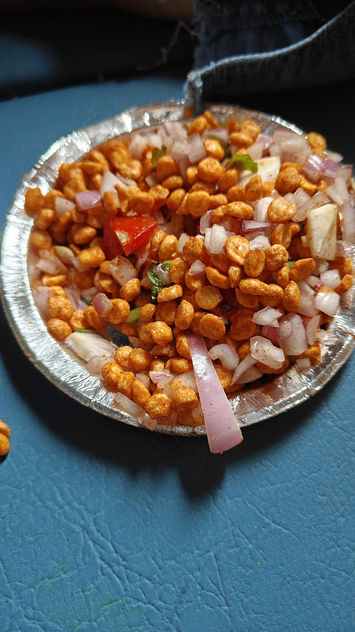 Alternative Text: A chana bhel sold on Indian Railways is a snack made from fried chana (lentils) mixed with onion, tomato, lemon juice, and other spices.