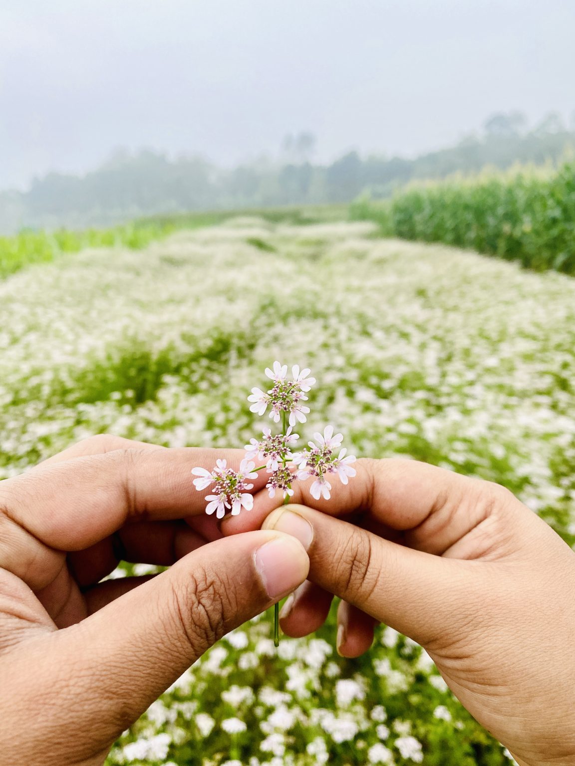 Alternative Text: Two hands hold small white and pink flowers in front of a field of flowers
