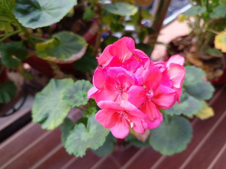 Alternative Text: A close-up of a pink flowering plant with clusters of delicate blossoms, surrounded by lush green leaves and other plants in the background.