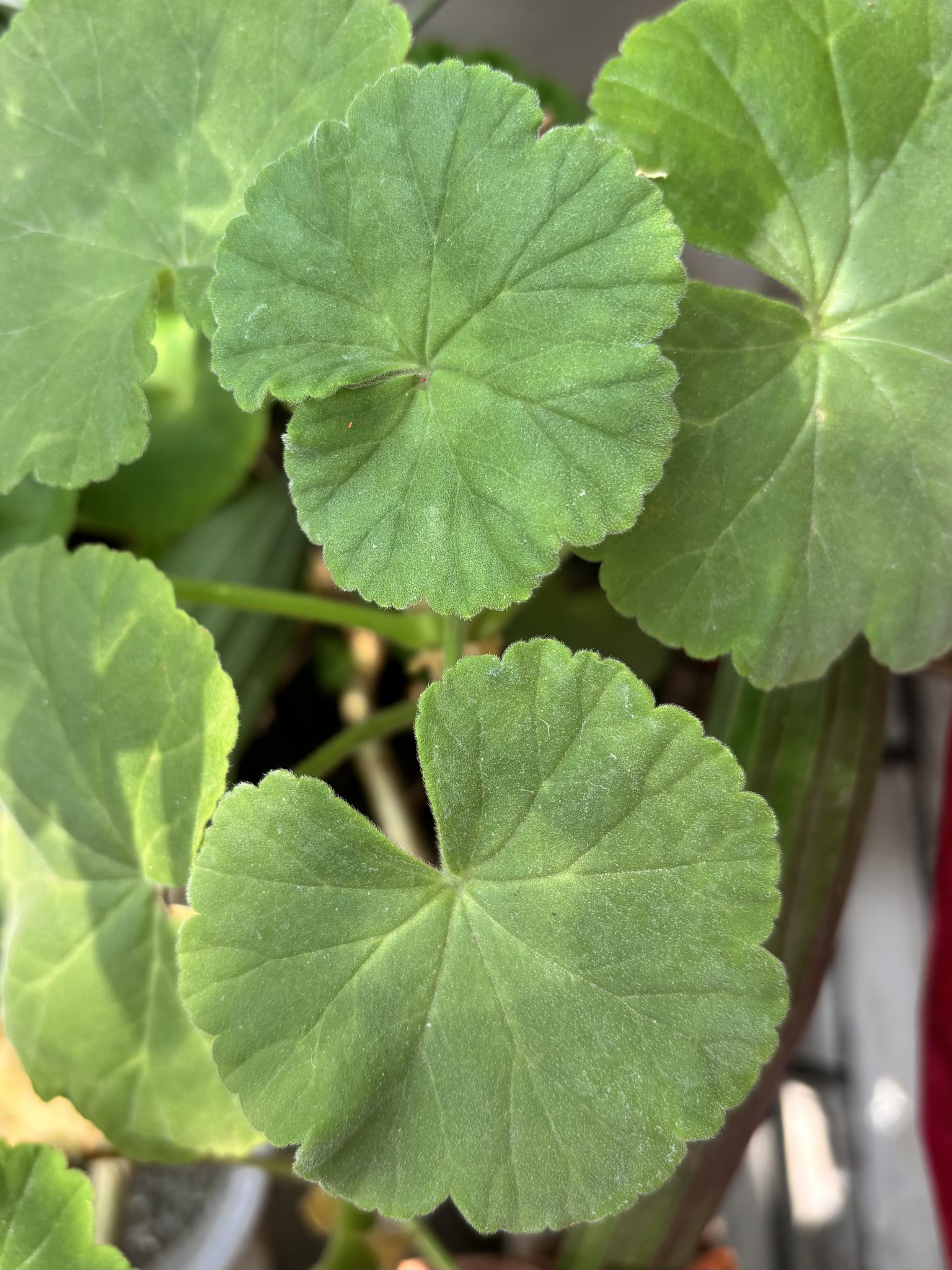 Alternative Text: Close-up of vibrant green geranium leaves with distinct ridges and round shapes, conveying a sense of freshness and natural beauty.