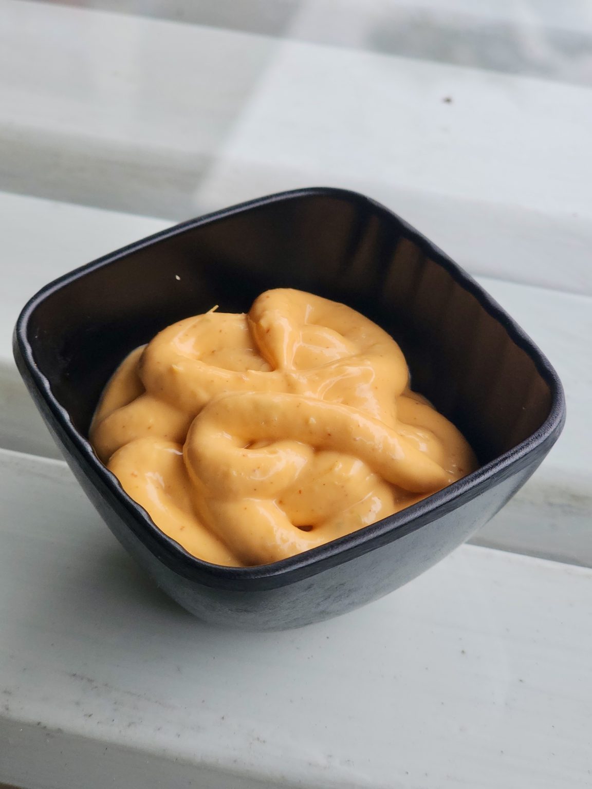 Alternative Text: Creamy orange mayo in a black bowl, a perfect dip from Kozhikode, Kerala.