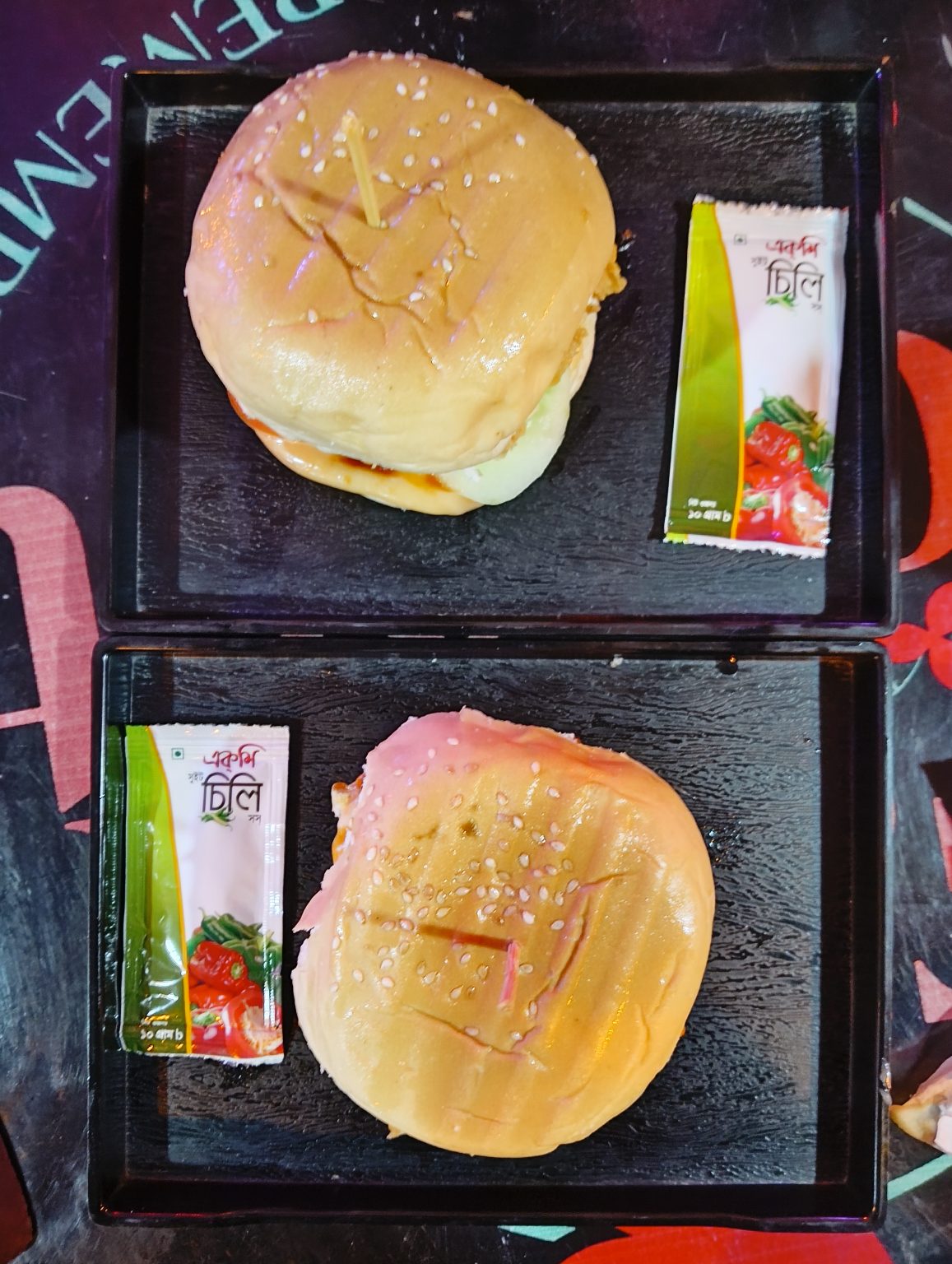 Alternative Text: A top down view of two sandwiches on burger buns, each in their own square tray, each with a packet of condiment.