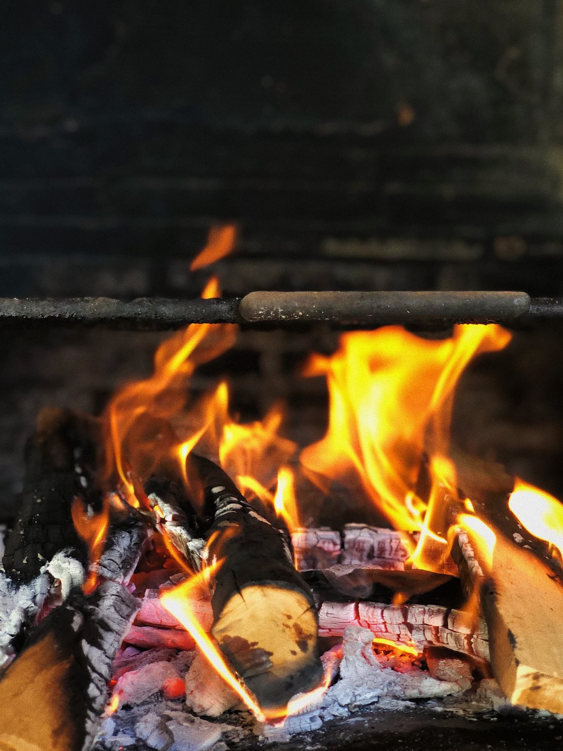 Alternative Text: Close-up of burning logs with bright flames, turning into ash and glowing embers in a fireplace.