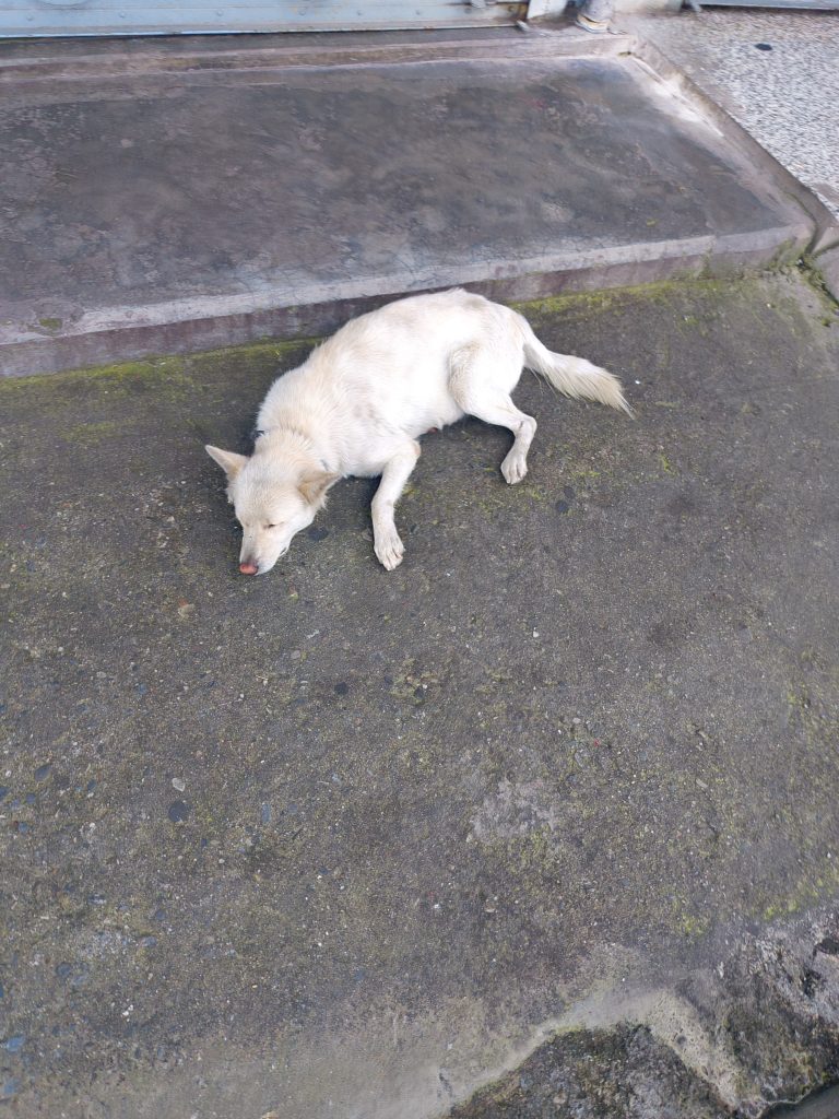 Alternative Text: A small, light-colored dog rests on a textured, uneven concrete surface with a faint doorway in the background.