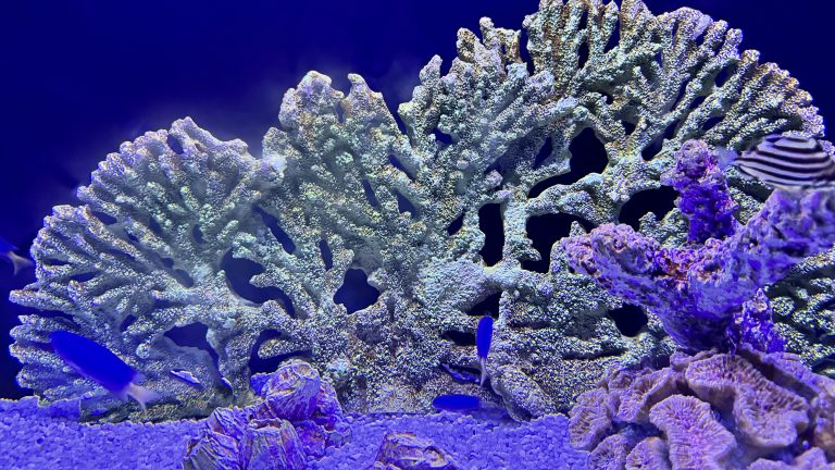 Alternative Text: A wide, branching green coral structure serves as a backdrop for several small, bright blue tropical fish in an aquarium.