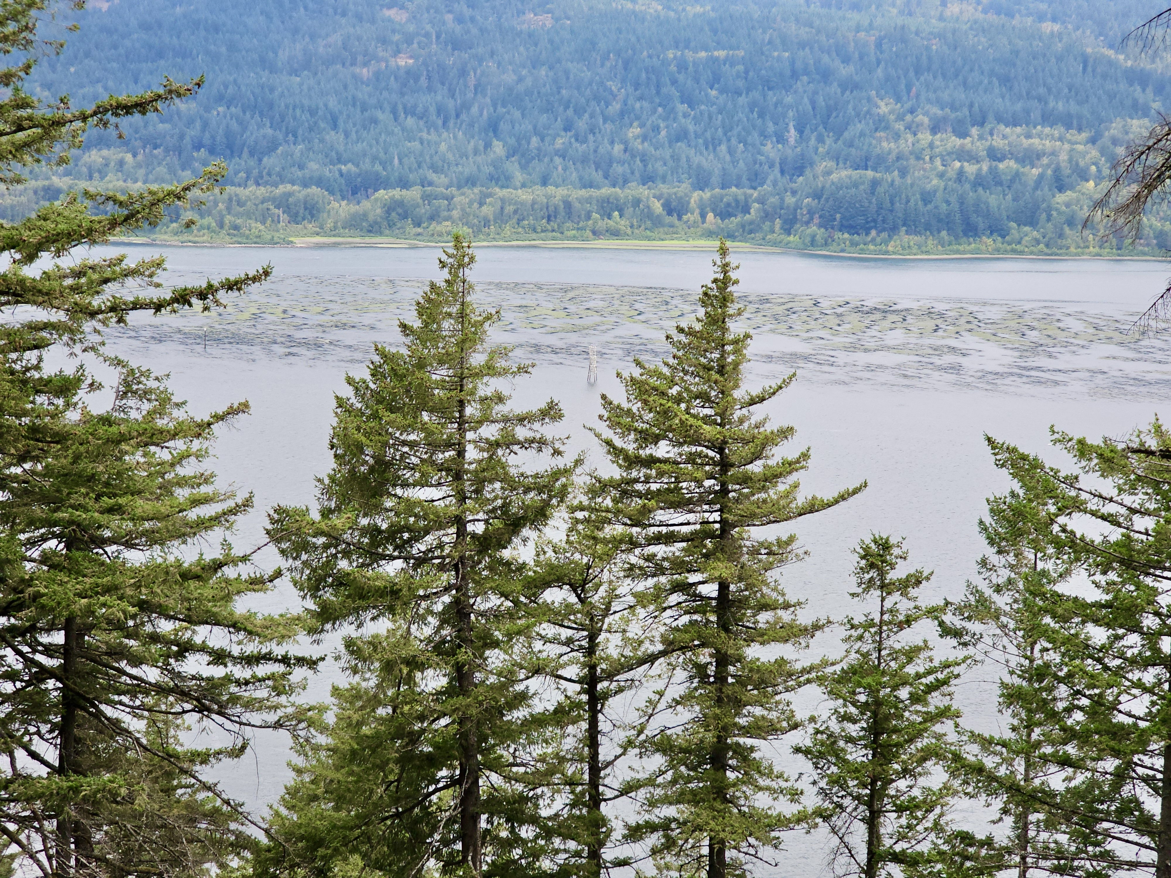 Alternative Text: Pine trees stand tall above the Columbia River in the Columbia River Gorge National Scenic Area, Oregon, overlooking patches of floating vegetation.