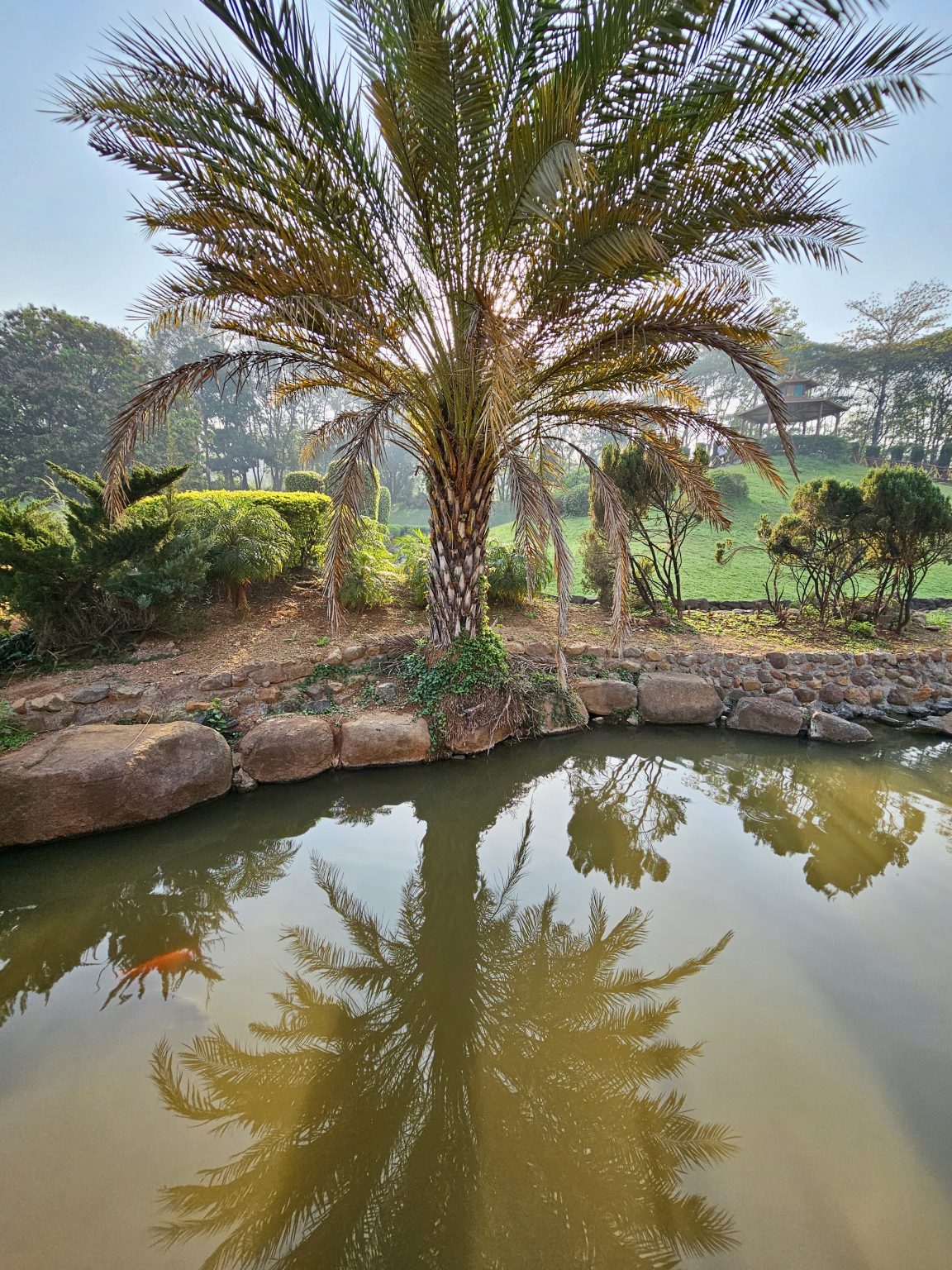 Alternative Text: A tranquil scene in the Okayama Friendship Garden, Pune, showing a palm tree reflecting in a pond with a koi fish swimming nearby. The morning sun shines through the leaves, creating a peaceful atmosphere.