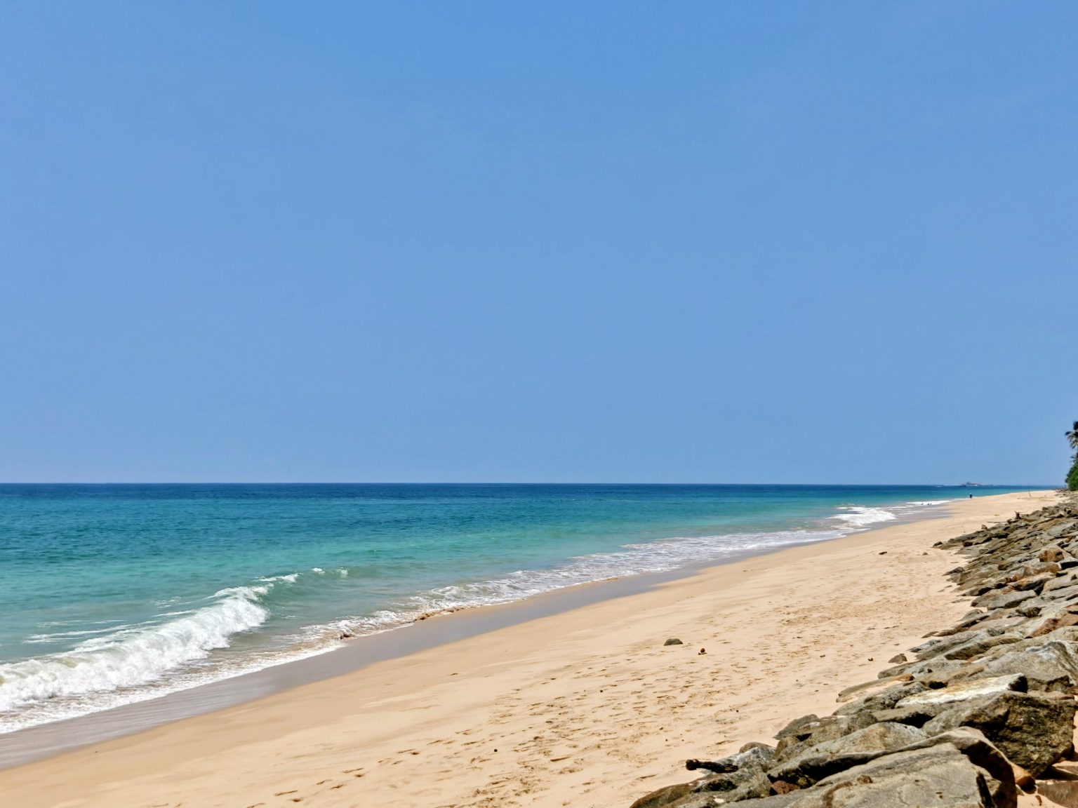 Alternative Text: Sandy beach in Bentota, Sri Lanka, with gentle waves of the Indian Ocean meeting the shore, clear blue sky above, and a rocky embankment running along one side.