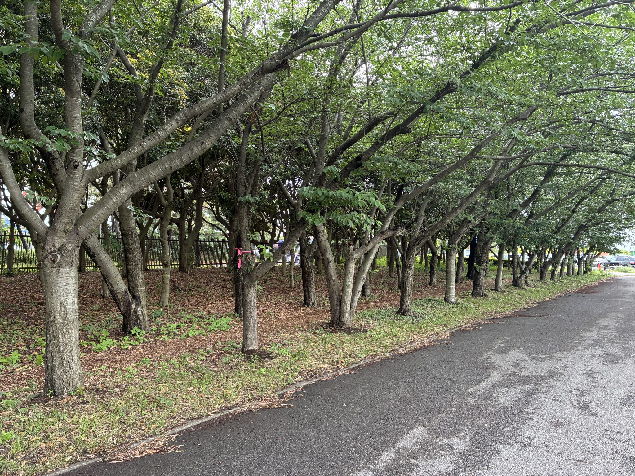 Alternative Text: A tree-lined path in Chiba Port Park, with diverse trees on each side and branches arching overhead.