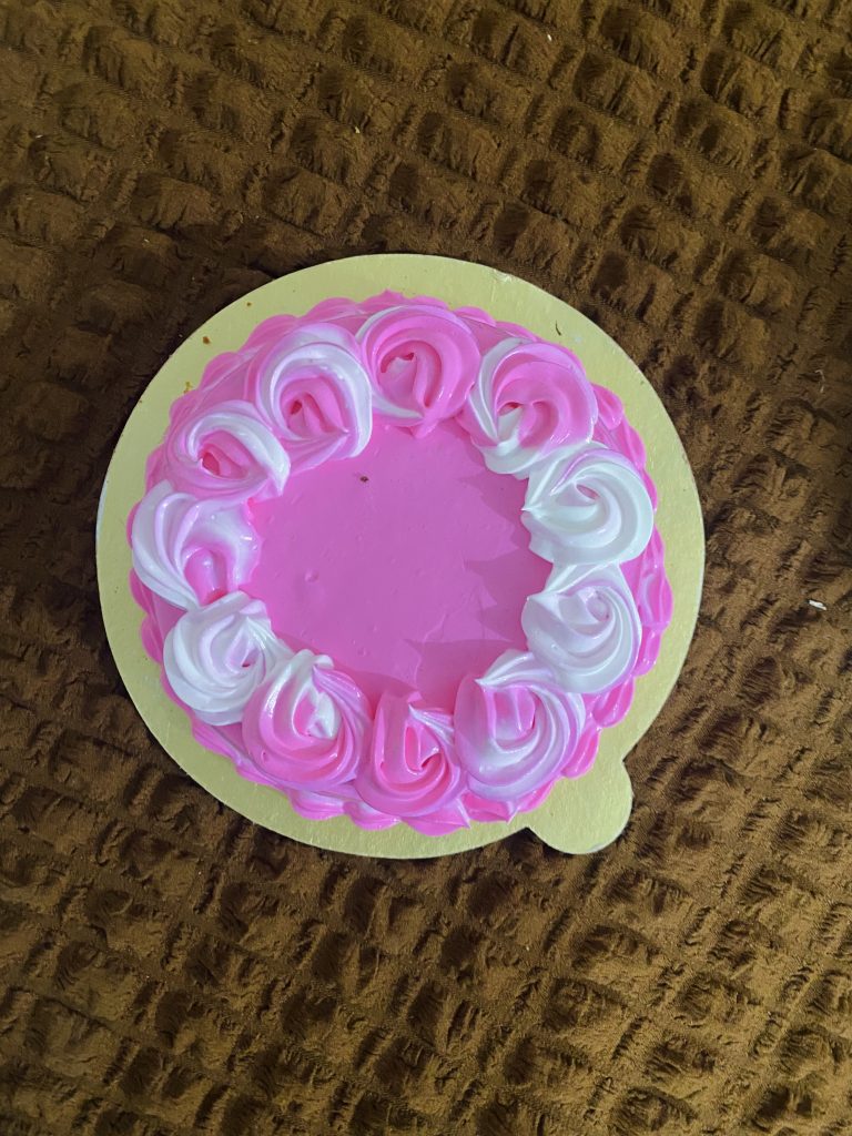 Alternative Text: A round pink cake with white and pink swirled frosting rosettes on top, set on a textured brown surface, creating a festive and sweet atmosphere.