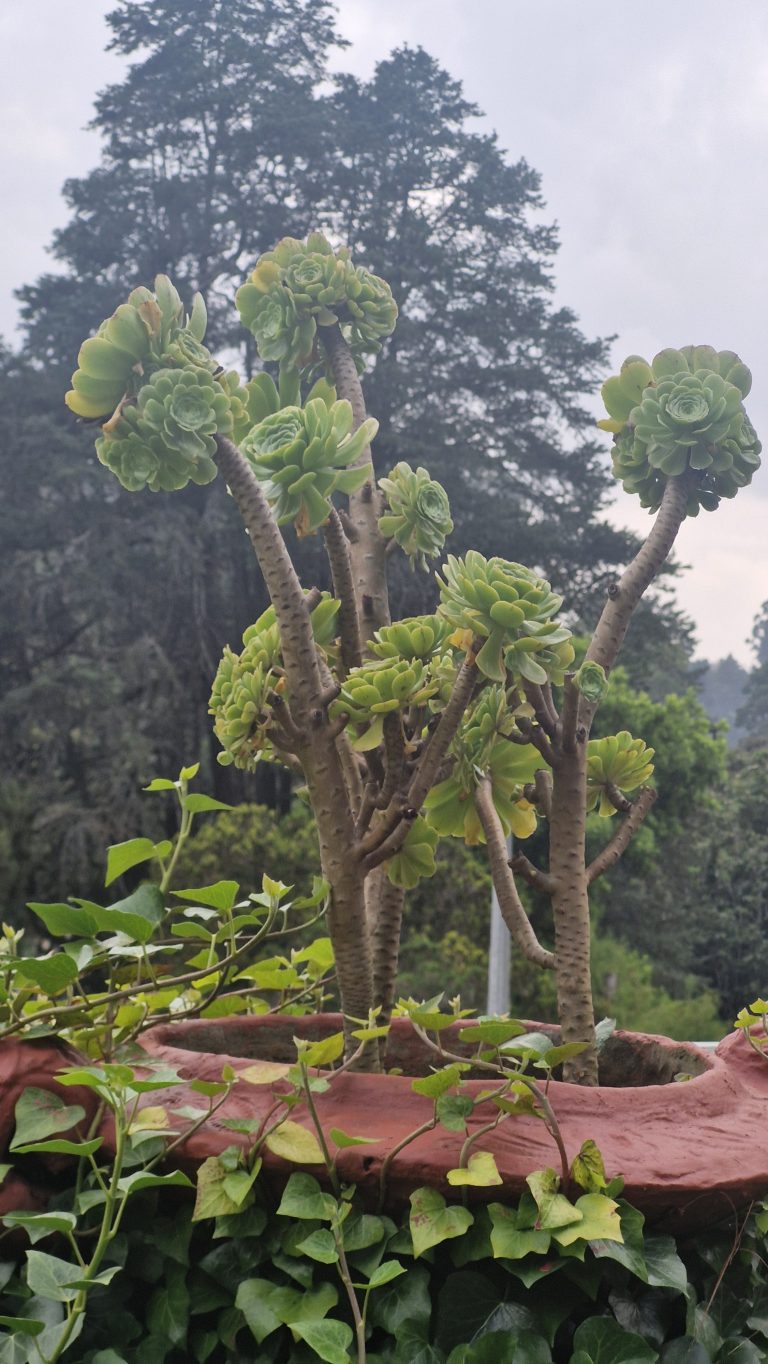 Alternative Text: A lush green succulent plant with multiple rosettes atop long, thick stems is displayed in a terracotta pot surrounded by green ivy.