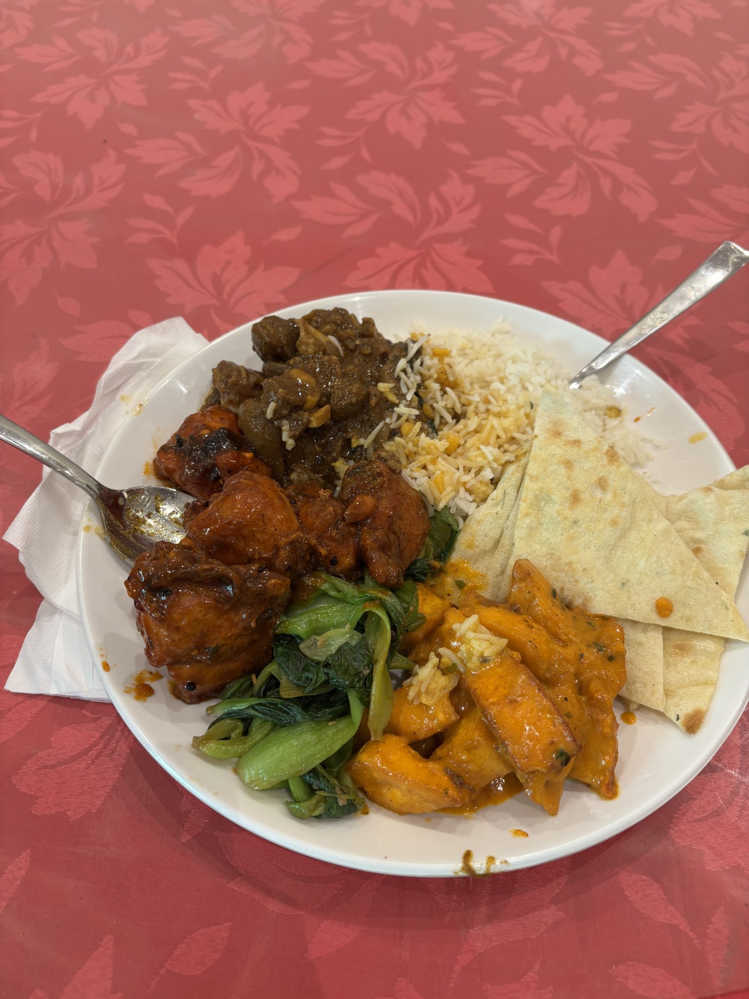 Alternative Text: A plate with grilled chicken in sauce, meat with gravy, rice, and sautéed greens.